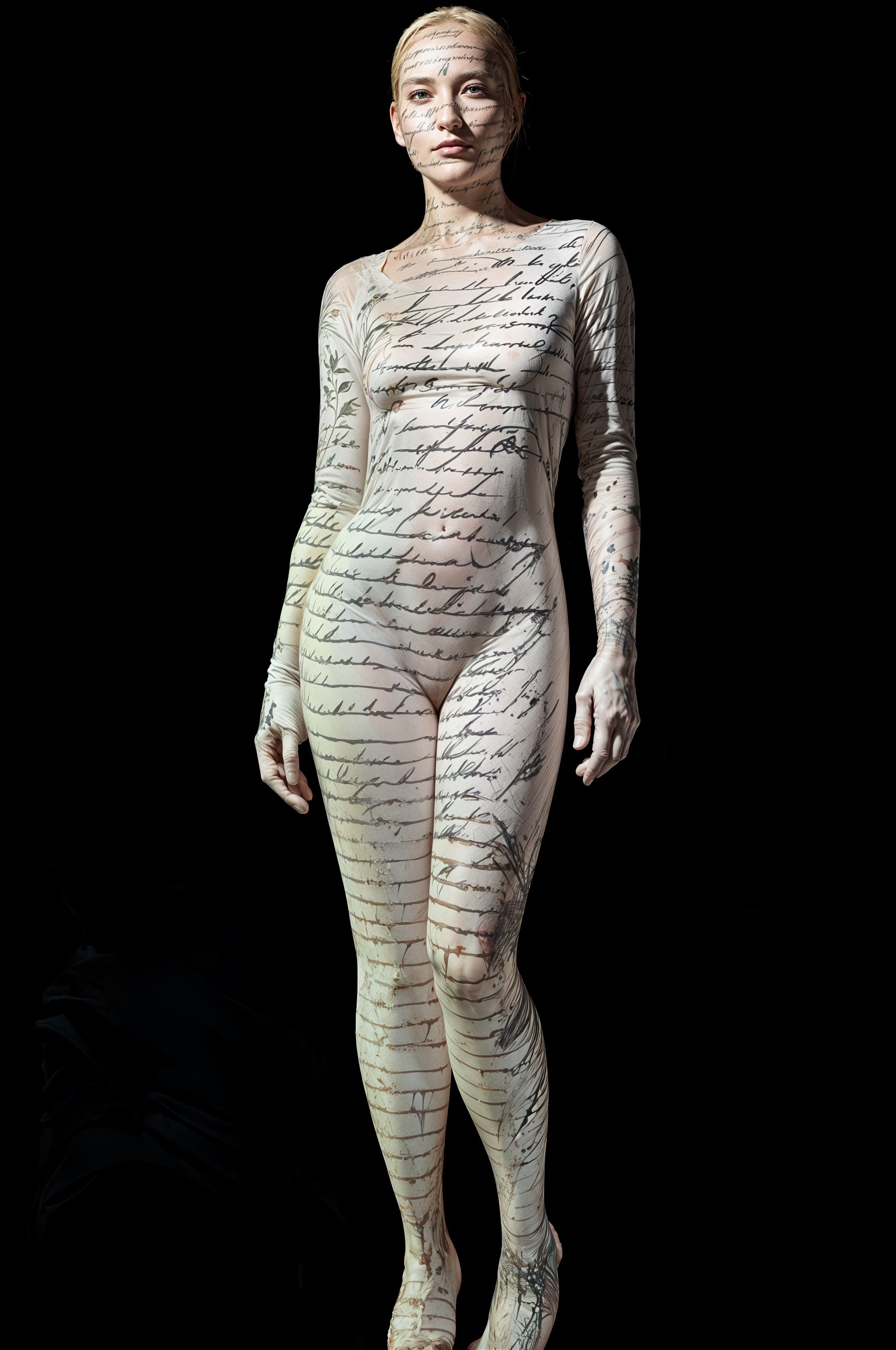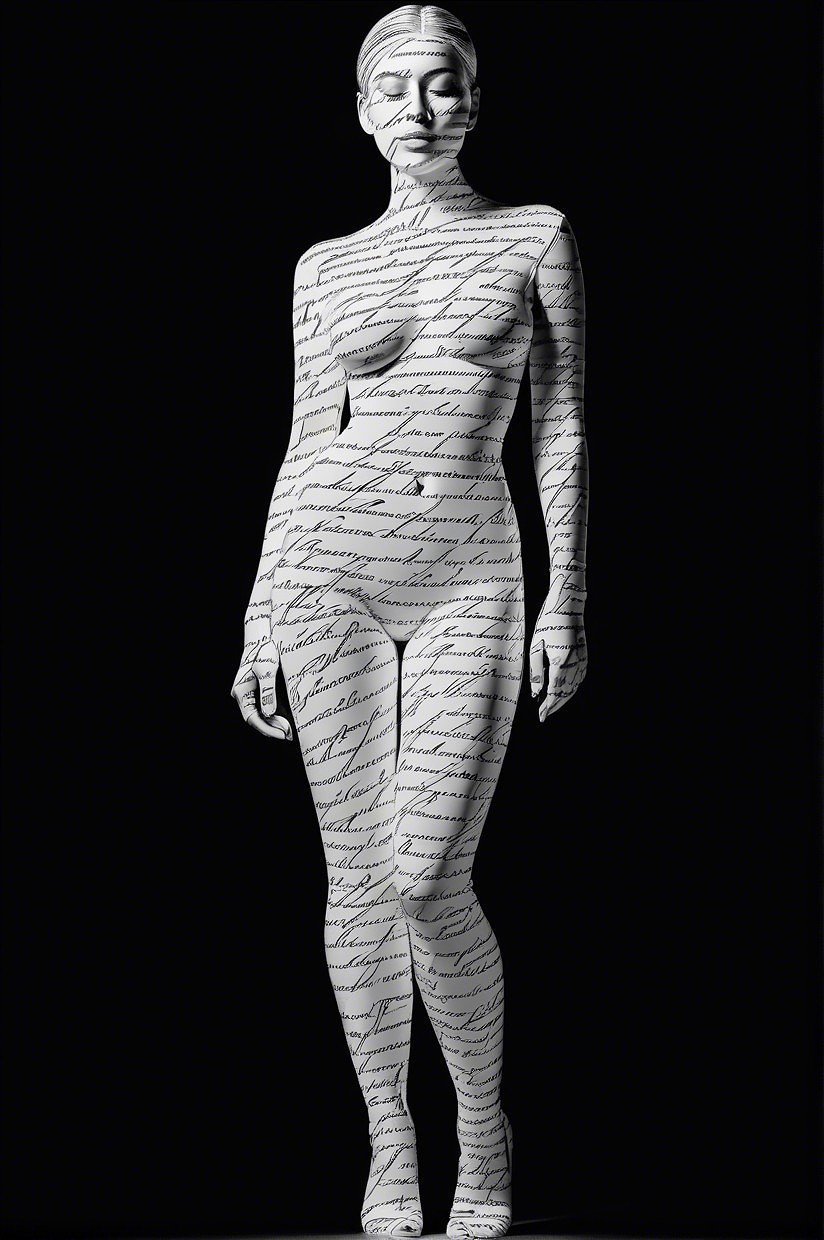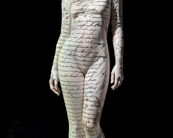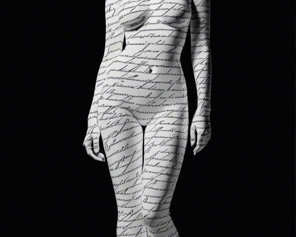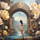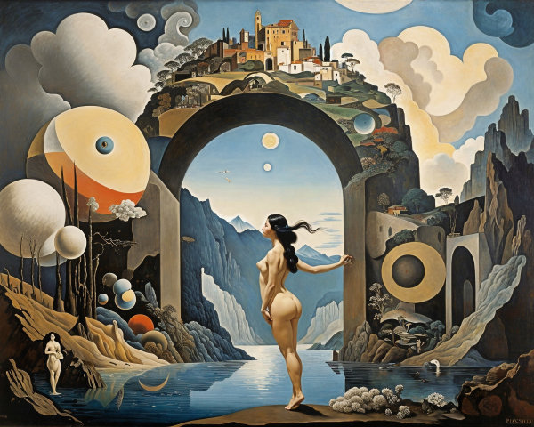 A surreal landscape features a nude figure standing by a tranquil body of water, gazing at an abstract archway leading to a whimsical town atop a rocky hill, surrounded by celestial elements.