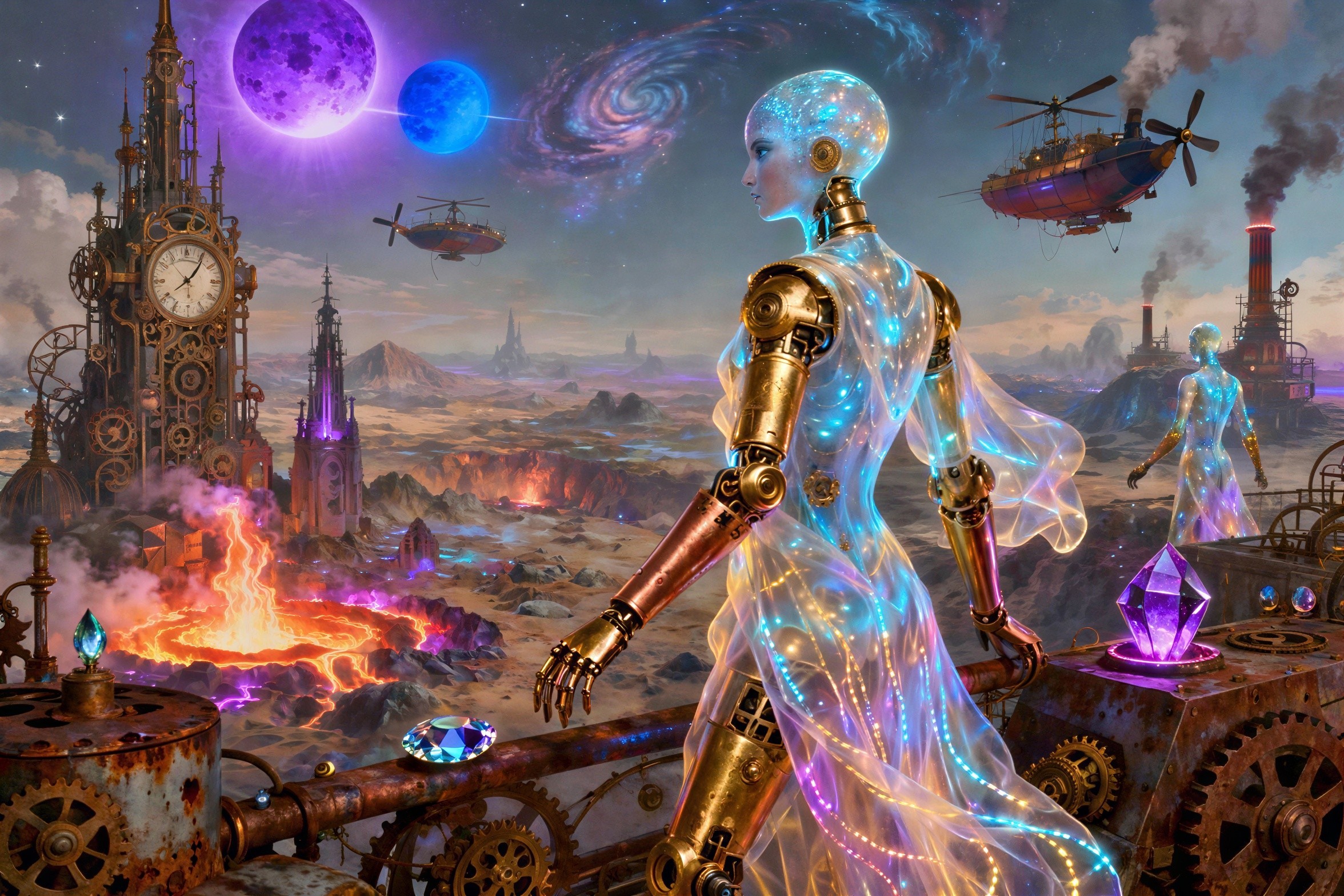 A detailed fantasy landscape shows a steampunk city on an alien planet with two moons. In the foreground, a female robot with golden mechanical arms and a translucent, glowing, iridescent body and head stands at the railing of an elaborate steampunk balcony, looking out at the city. She wears a flowing robe of light