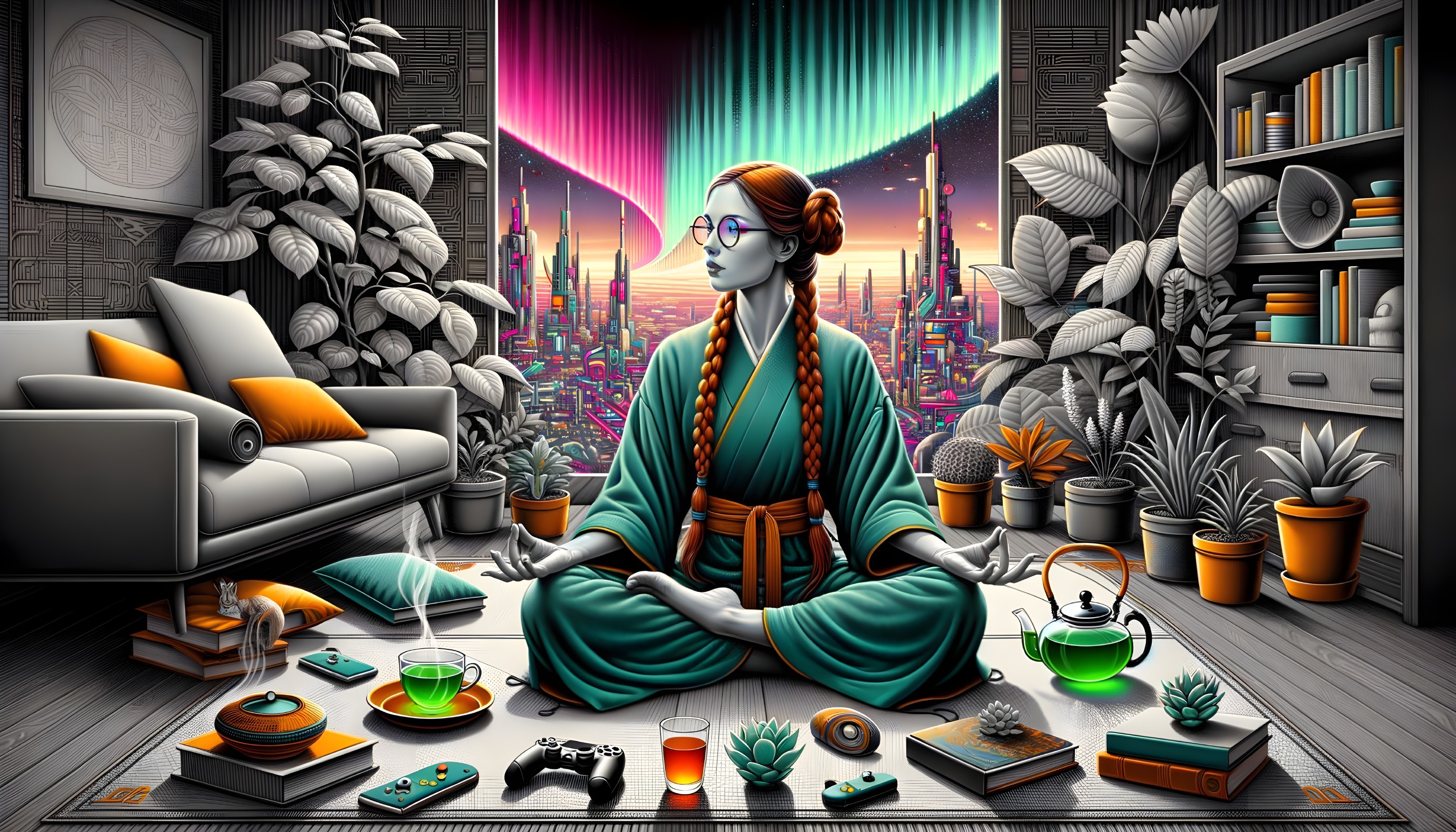 A woman in a green robe meditates in a vibrant, futuristic room filled with plants, books, and a view of a neon-lit cityscape.