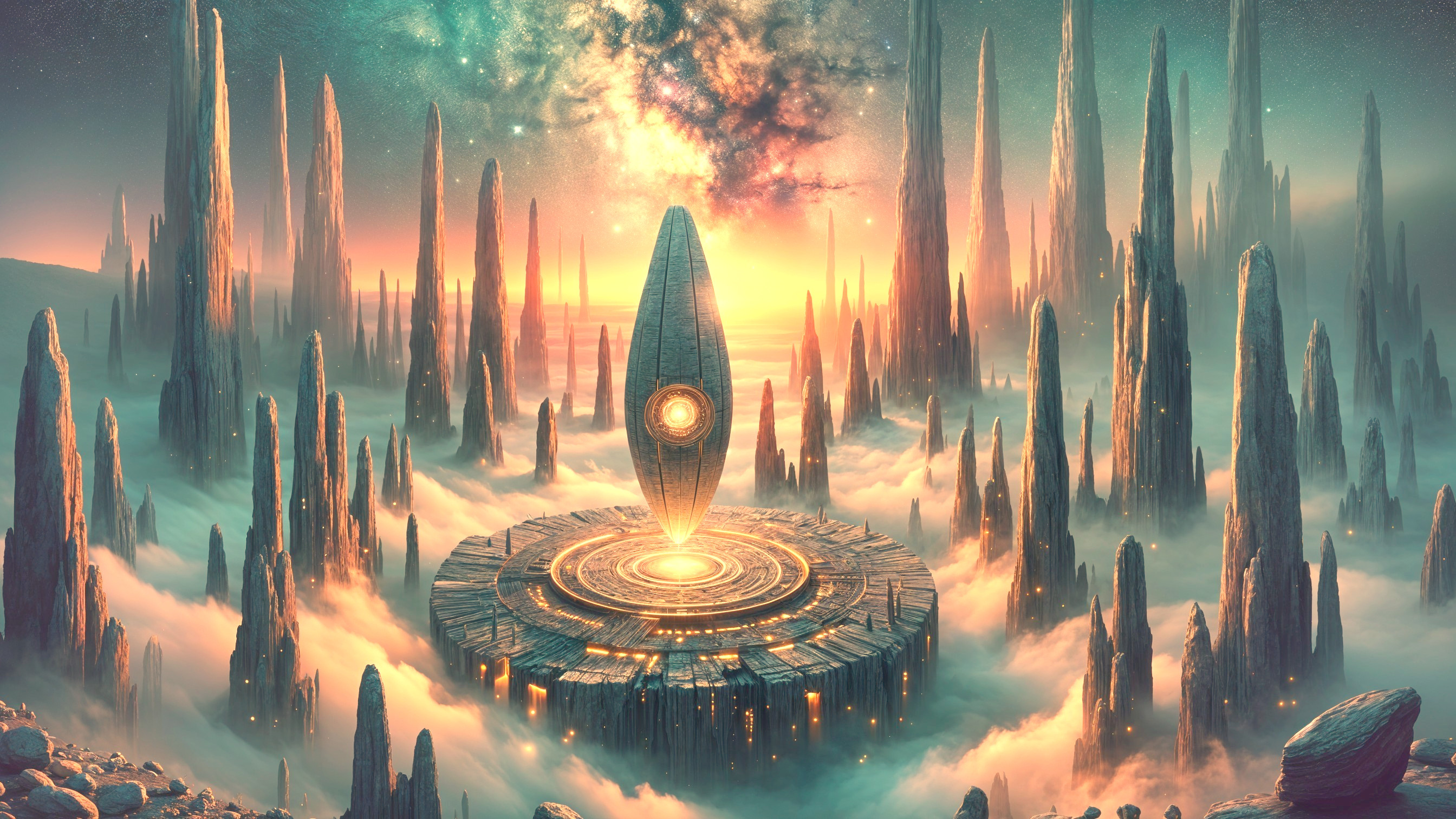 A surreal landscape features towering stone spires reaching towards a vibrant, cosmic sky. In the center, an ancient, glowing artifact stands atop a circular platform, surrounded by mist.