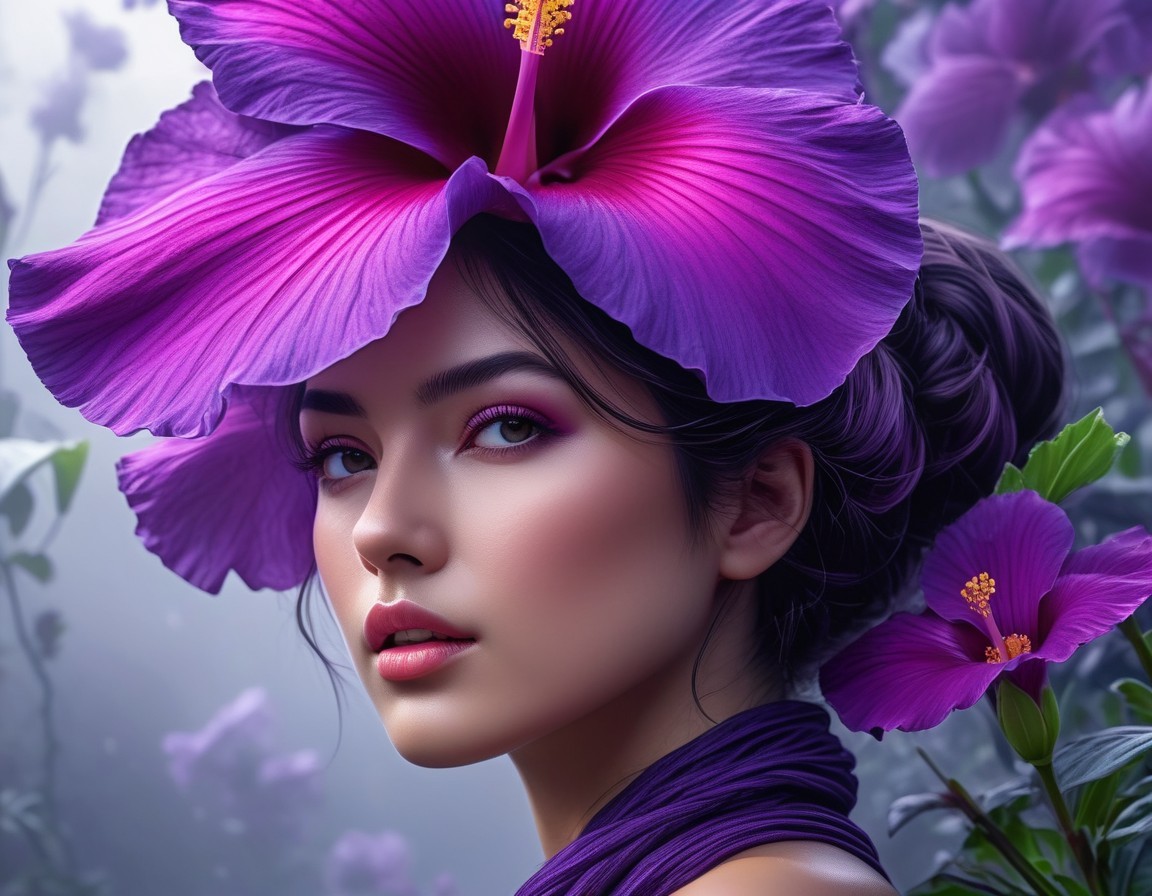Purple  ibiscus lady, ultra hd, realistic, vivid colors, highly detailed, UHD drawing, pen and ink, foggy, perfect composition, beautiful detailed intricate insanely detailed octane render trending on artstation, 8k artistic photography, photorealistic concept art, soft natural volumetric cinematic perfect light, ultra hd, realistic, vivid colors, highly detailed, UHD drawing, perfect composition, beautiful detailed intricate insanely detailed octane render trending on artstation, 8k artistic photography, photorealistic concept art, soft natural volumetric cinematic perfect light