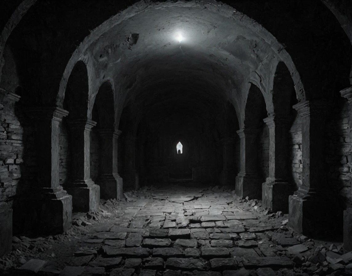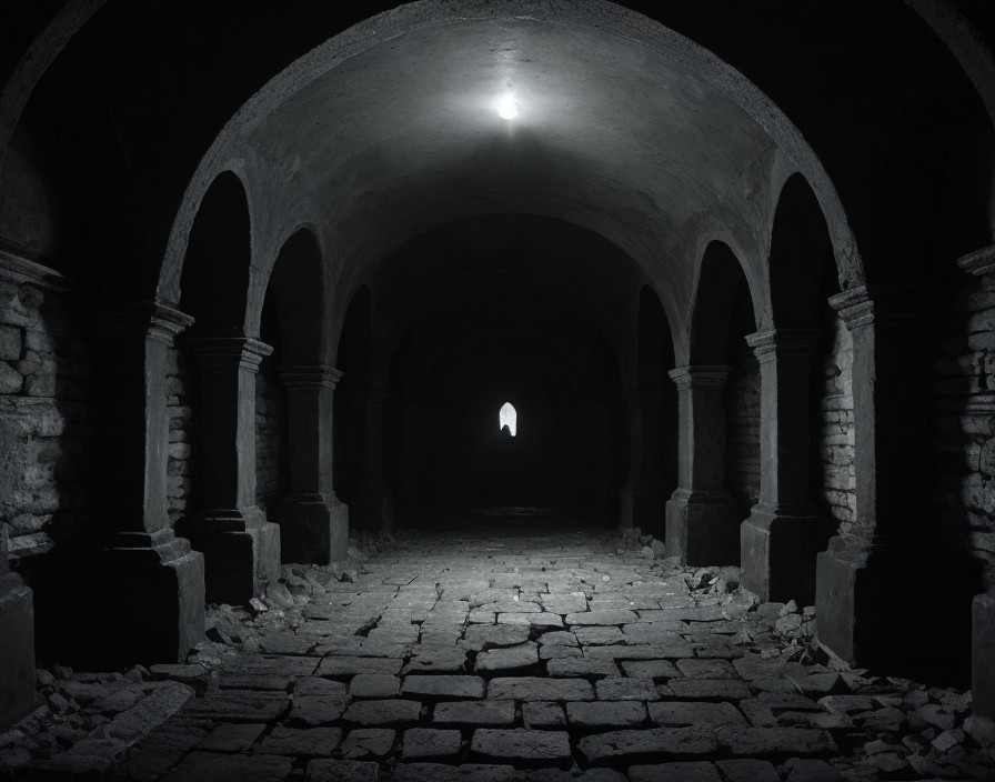 Prompt: in the terrible catacombs, Scary and hidden characters, An eerie ambiance surrounds a forgotten space . Dark, mysterious, negative space, sad, highly detailed, digital painting, by [Michelangelo], deviantart.