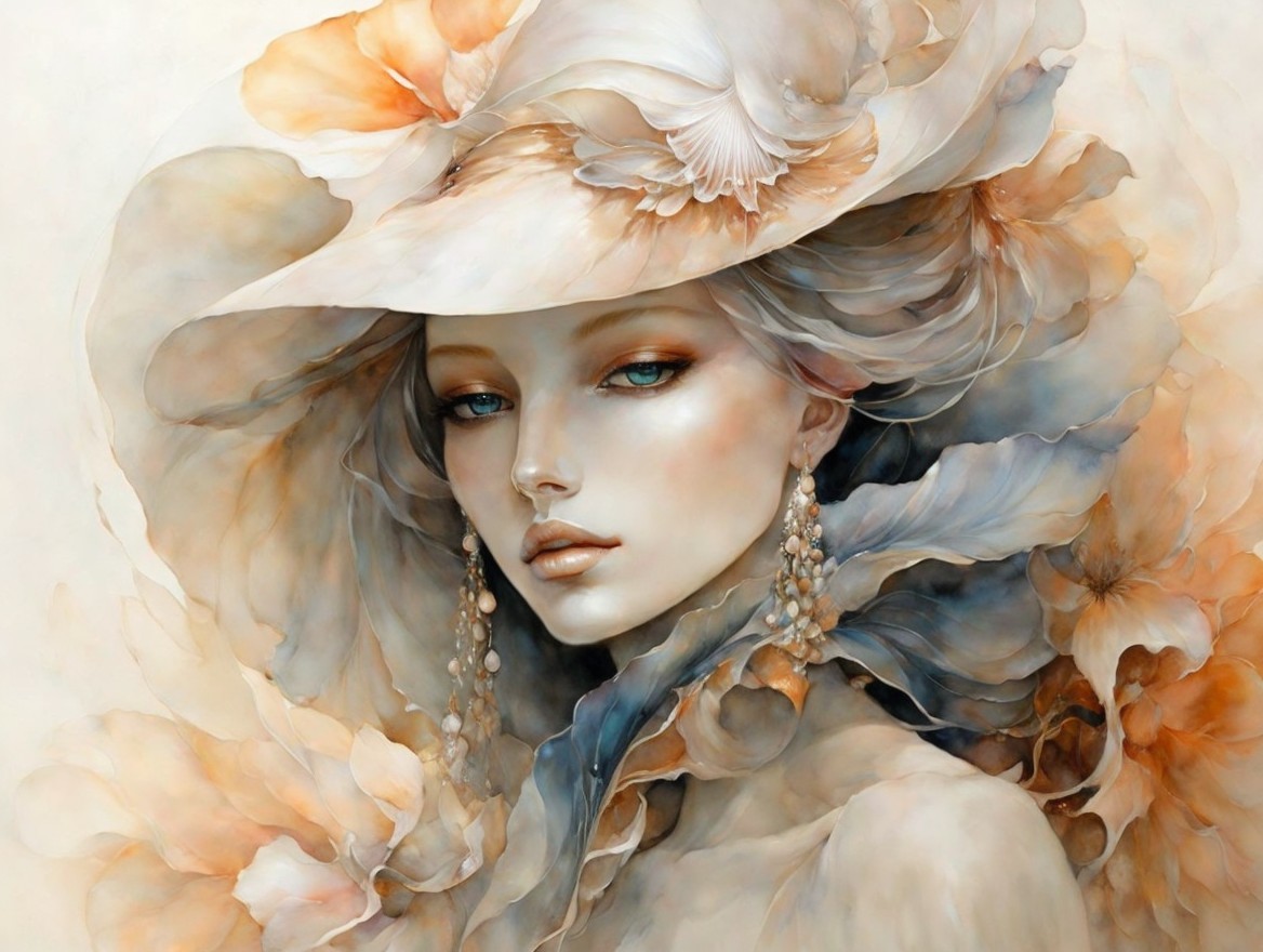 An artistic rendering of a person with a shell-themed hat, detailed with soft colors and a serene expression.