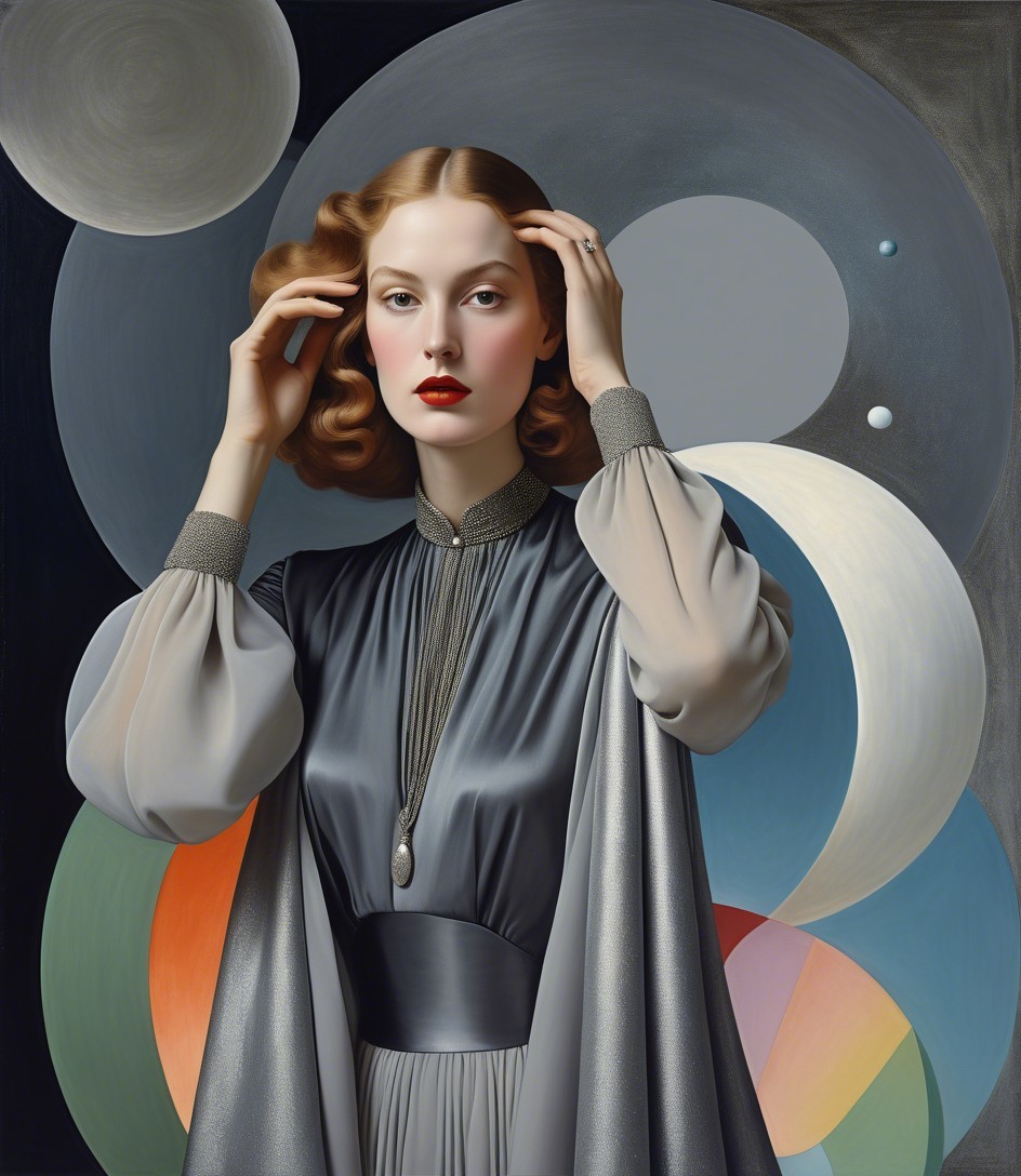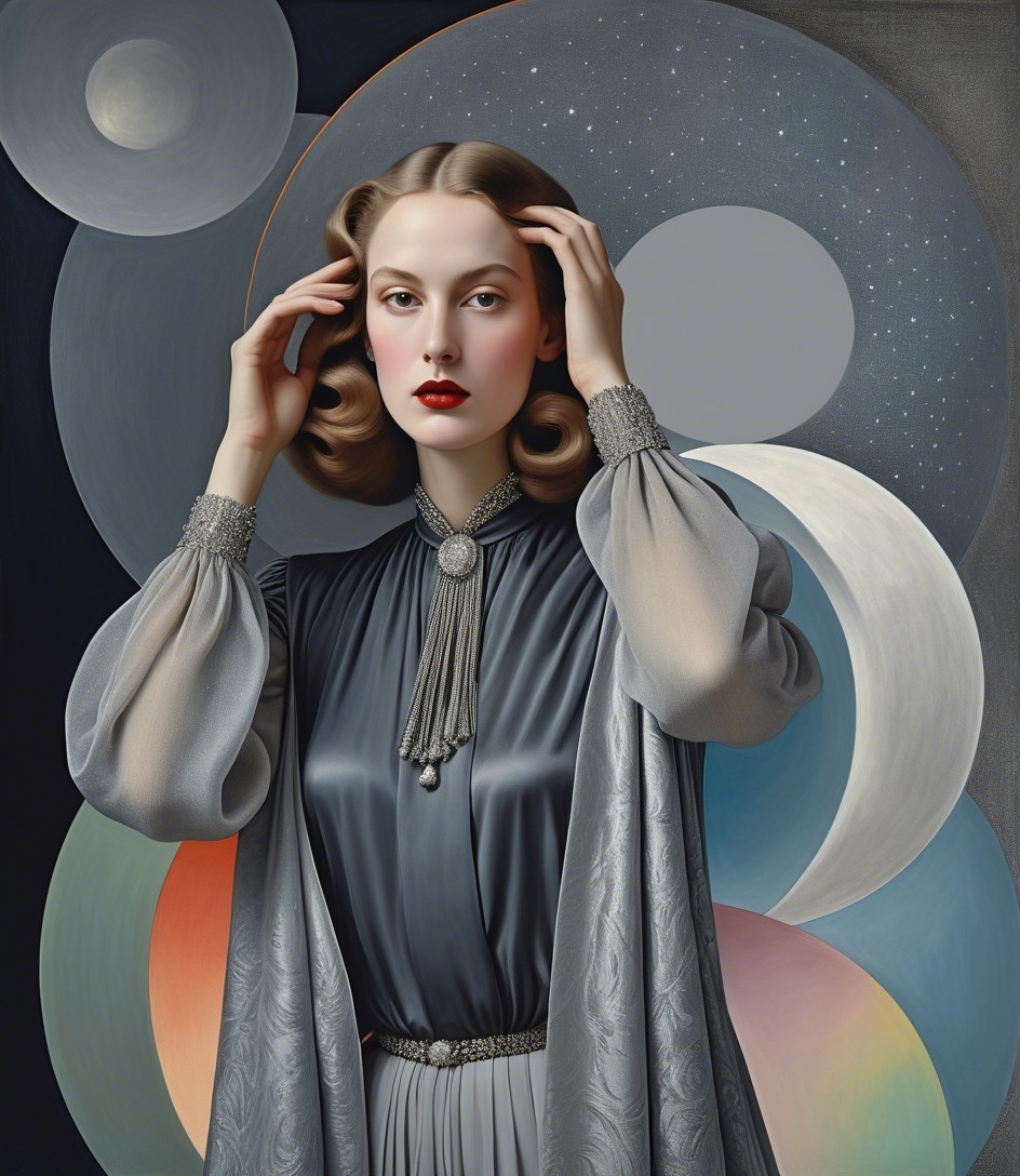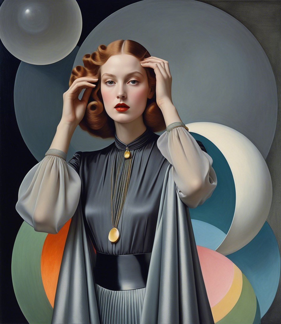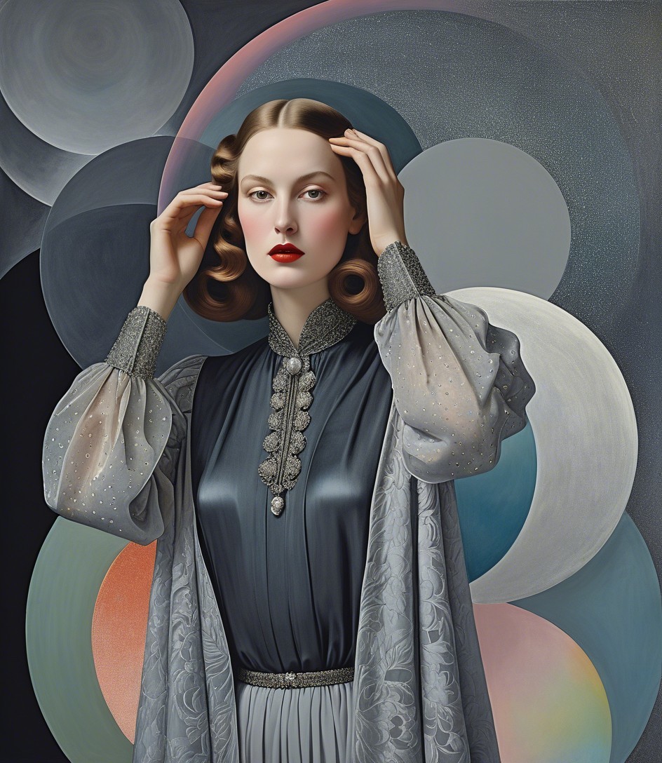 A woman with elegant, retro curls poses in a flowing, gray dress. Her bold red lips contrast with soft pastel circles in the background, creating a striking, artistic composition.