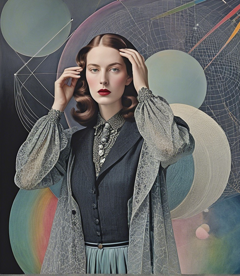 Prompt: Surreal portraiture with Hypotrochoid patterns. Style of imaginative realism merged by Frederic Leighton, Saul Steinberg, Michael Herring, hues by Leonor Fini, tints by Leonora Carrington, lighting by Hilma af Klint, coloring by Dean Ellis, split toning by Man Ray, color (decalcomania), line-art details,high coloring, flares, flecks, shapes, triadic color scheme silver-grey, beige lilac, serene Gothic woman, smirky smile, textured with hatching details full-width papercut, featuring a beautiful and detailed scenery. Focus on creating an illusion of flowing hair with sculpted bas-relief effects, incorporating metallic colors and an extremely colorful palette. Infuse traumacore whiffs for a dark Gothic twist, ensuring crisp quality and HDR enhancement at 64K resolution. Explore paper art techniques. Uhd, hdr, vfx. Create a gloomy aesthetic with melting hues and grained paint, influenced by surreal art. Opt for a triadic color scheme of purple, green, and grey, complemented by burnt orange and sepia tones. Emphasize detailed linework, shades for depth and scale. Implement 3D effects for luminosity. Overall composition by Overton Loyd, portrait of an irresistible beauty of a girl with expressive eyebrows and eyes, stiyle dark fantasy v3, bare shoulders, painted in gloomy gothical style by Paul Klee, mysterious warm light, Optical illusion by Dee Nickerson, mysterious, expressionistic composition, wavery coloring by Helen Frankenthaler, High chromatic induction, pastel, graphite and charcoal, Reverse pathogen light, tints by Miriam Hoffmann,