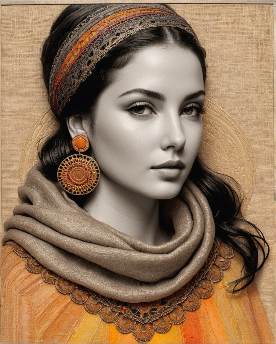 A striking portrait of a woman with dark hair, adorned in an orange and beige outfit. She features intricate earrings and a headpiece, set against a textured, warm background.