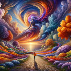 A figure in an orange cloak walks along a winding path through vibrantly colored flowers, with a stunning seascape and dramatic clouds in the background, creating a magical, serene atmosphere.