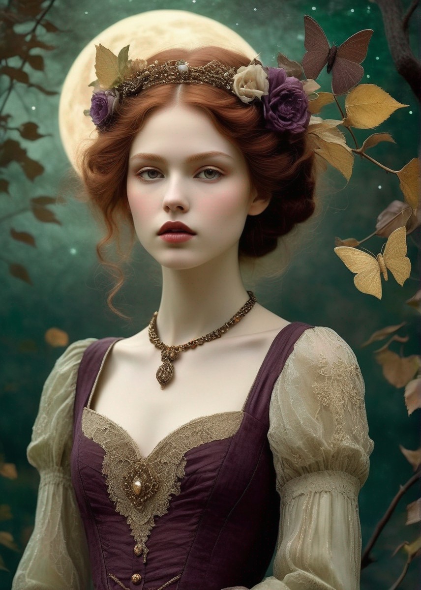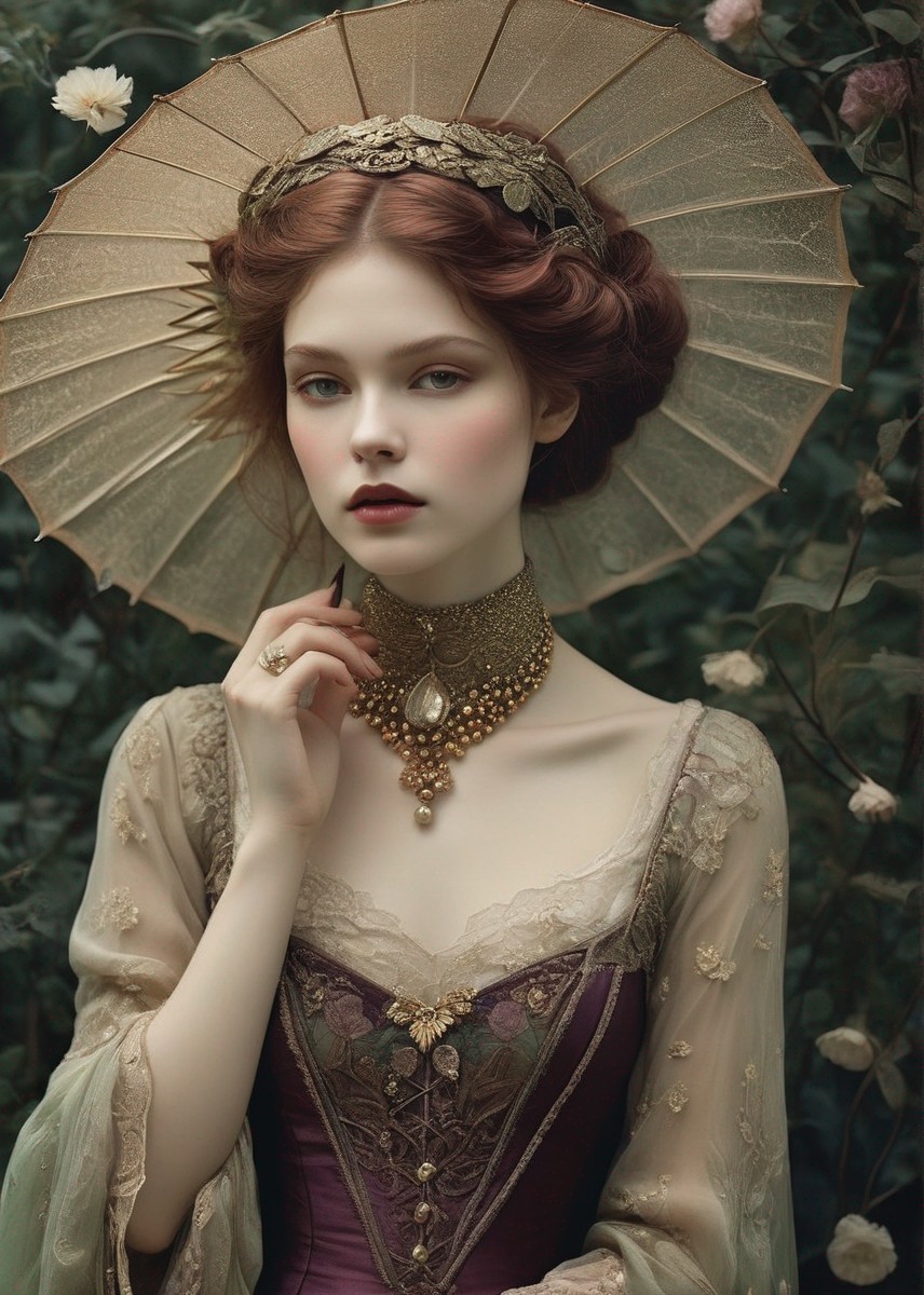 An illustrated woman with a wide-brimmed hat and a flowing dress sits elegantly among water lilies.