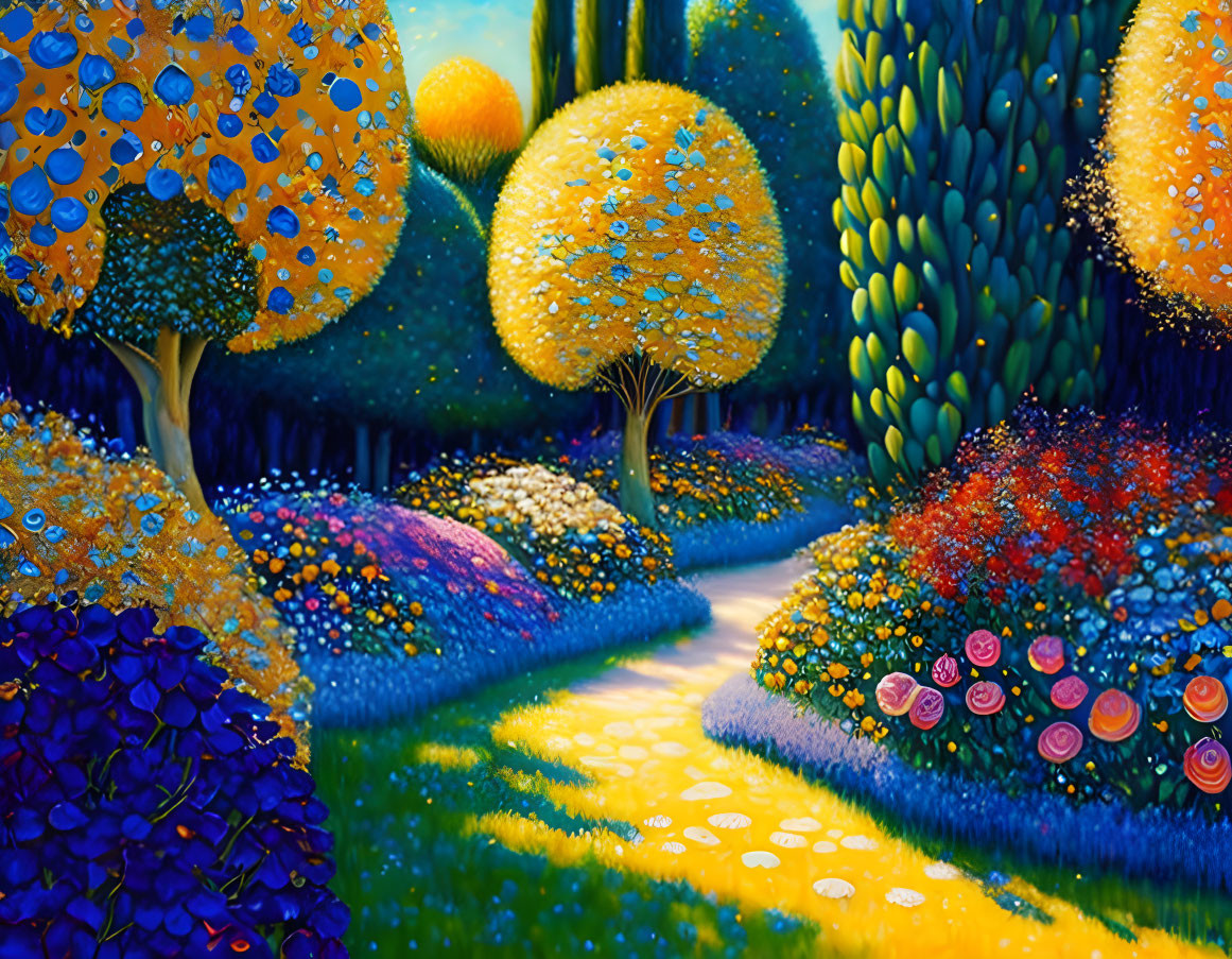 A vibrant, stylized painting of a whimsical garden with colorful, dotted trees, and a winding path amidst blooming flowers.