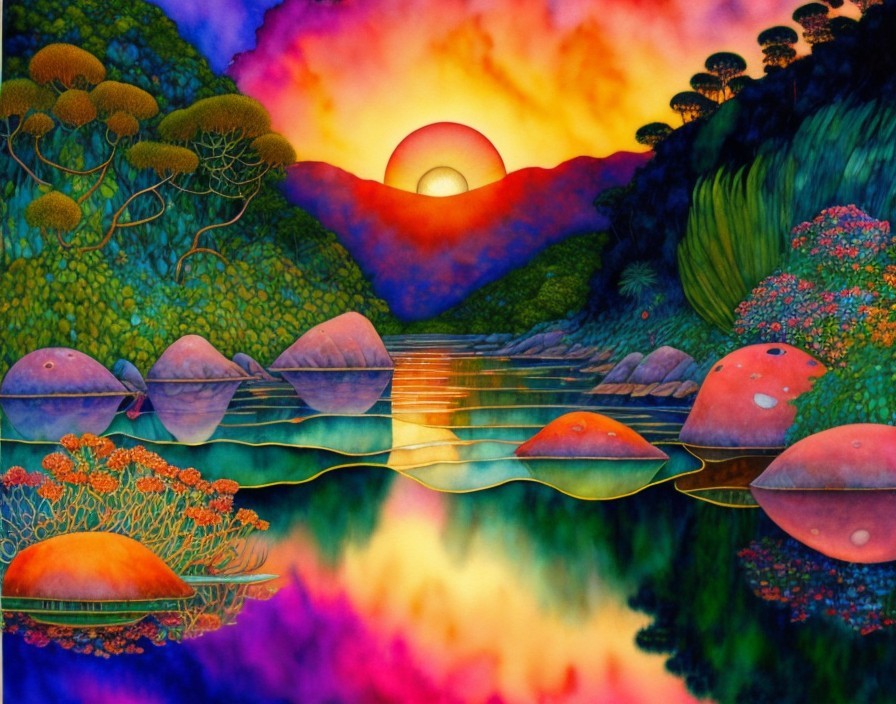 Prompt: "Full page, no mat, no frame, 3D watercolor, fantastic Wide view, in the very best style of Gustav Klimt, a spectacular sunrise reflected in a beautiful Tingatinga style jungle river, satiny, high quality, shimmering, elegant, with vibrant spectacular colors, elegant, highly detailed, glistening magic style, by Alphonse Mucha"