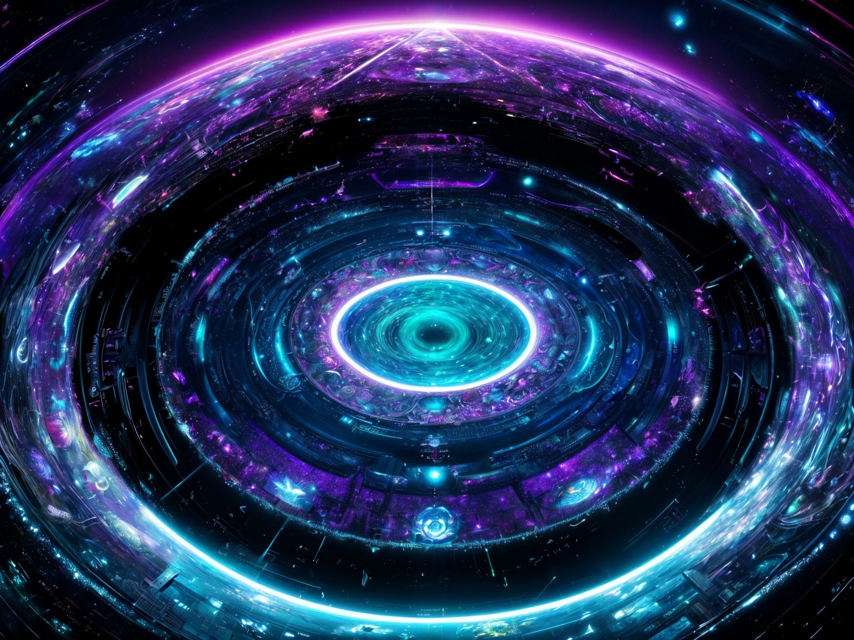 A cosmic scene featuring concentric circles of vibrant purple and blue, revealing various celestial bodies. A lone figure stands on a rocky surface, gazing into the mesmerizing depths of space.