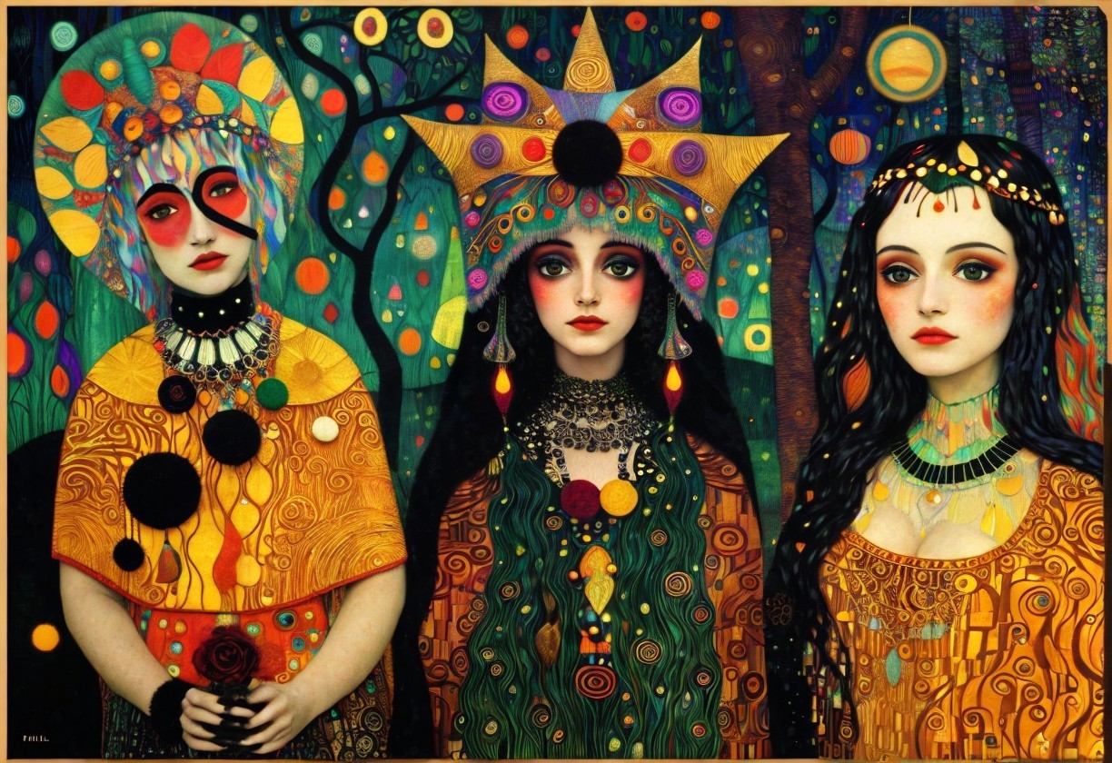 Three stylized, colorful female figures with intricate patterns and adornments, set against a vibrant, decorative background.