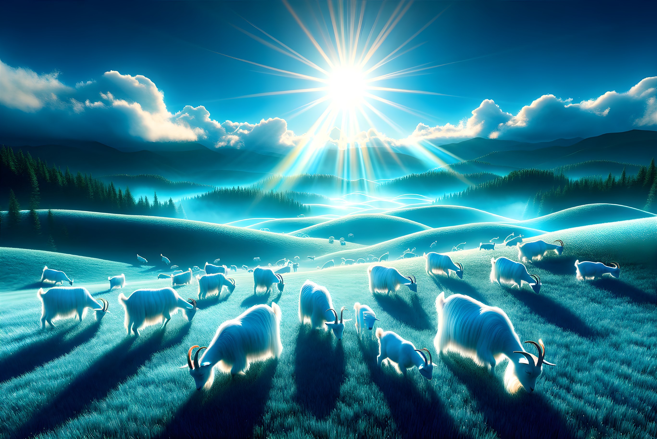 A fantastical landscape with sheep grazing under a radiant sun, casting long shadows on rolling, mist-covered hills.