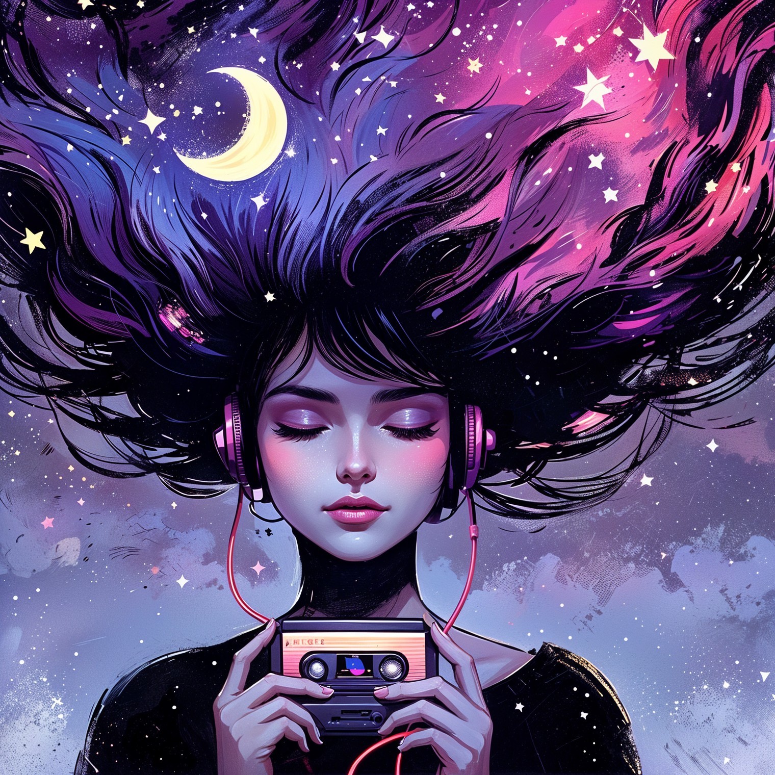 An illustration of a girl with flowing hair blended with a cosmic sky, wearing headphones and holding a cassette player.