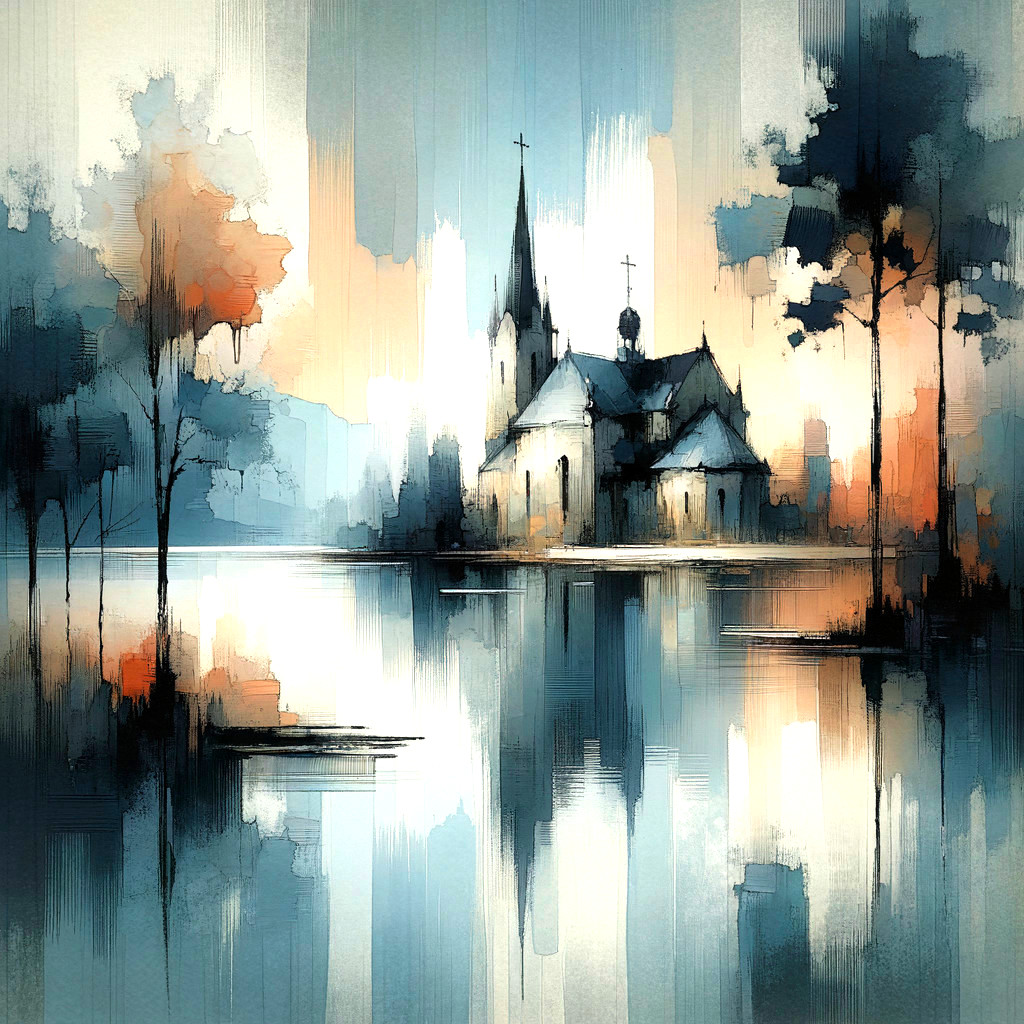 A serene landscape features a picturesque church reflected in calm waters, surrounded by abstract trees. The scene is painted in soft hues of blue, orange, and white, evoking tranquility.