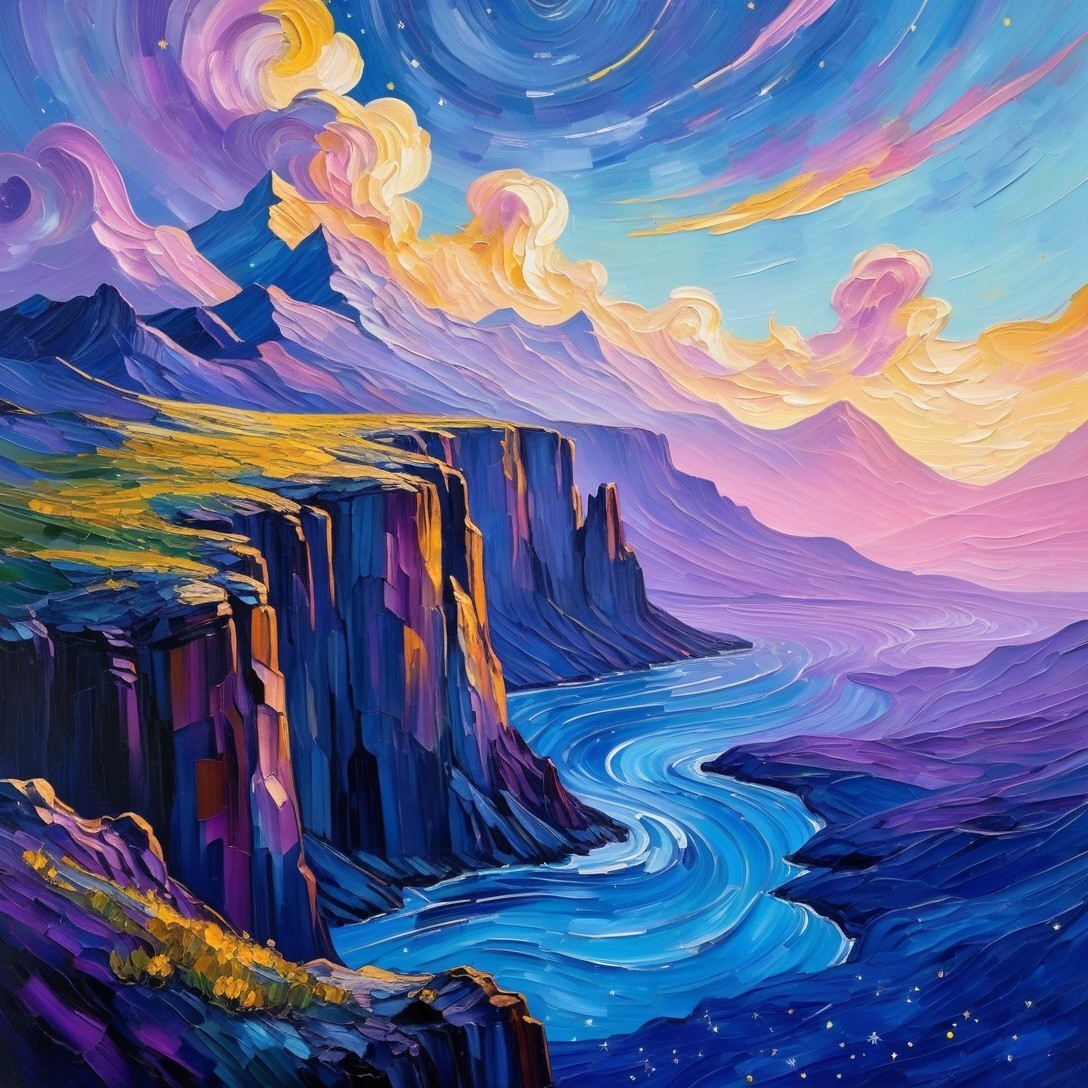 A vibrant landscape features bold, swirling colors of purples, blues, and yellows. Mountains stand tall under a starlit sky, while a winding river flows through the valley below, capturing twilight's essence.