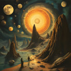 Two explorers walk along a sandy shore under a massive, glowing moon. Unique rock formations rise around them, while a starry sky filled with planets adds a sense of wonder to the alien landscape.