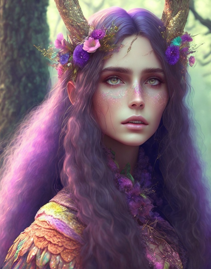Beautiful pastel witch in the forest with crystals on forehead and beautiful jewelry.