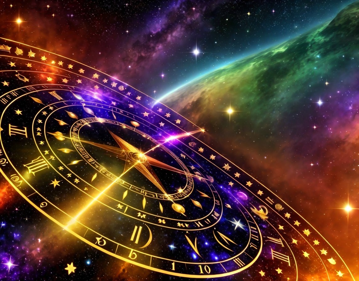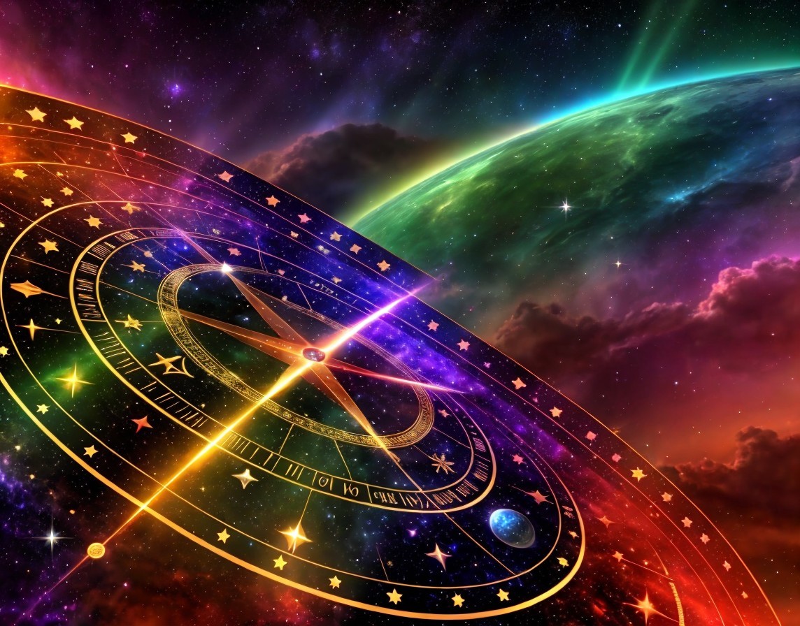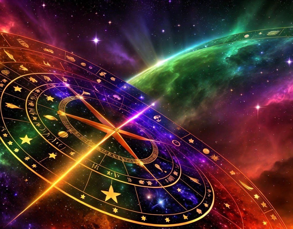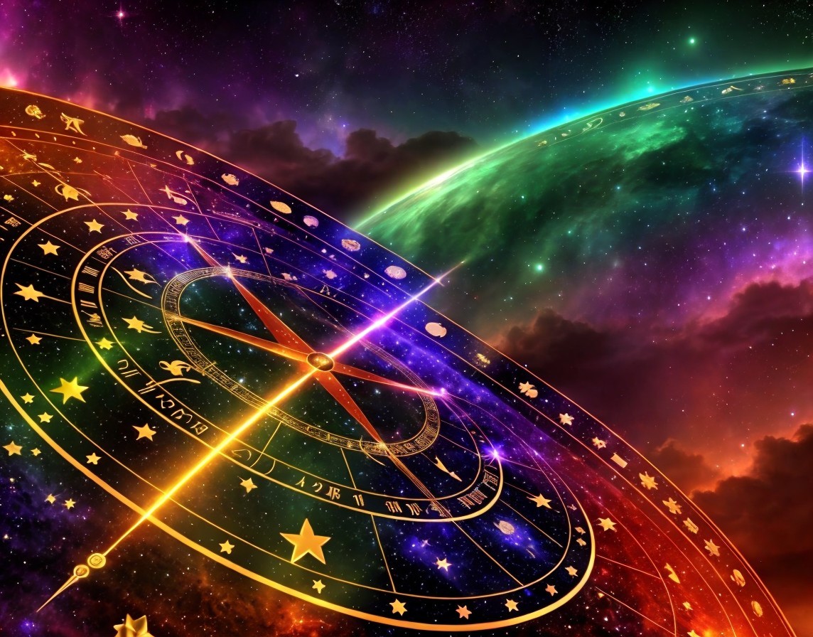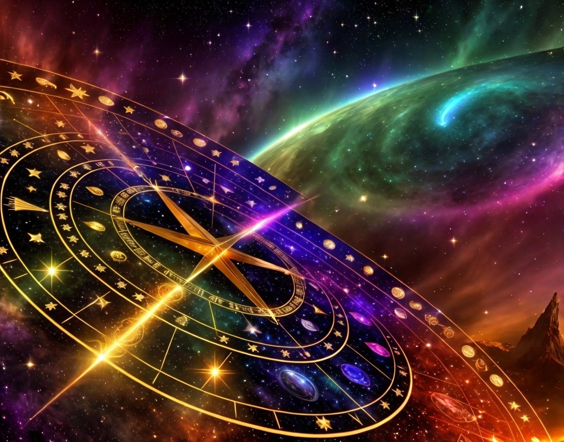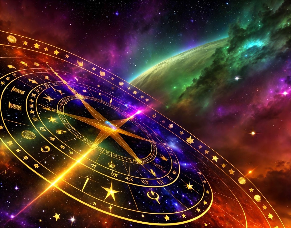 A vibrant cosmic background with a zodiac-themed astrolabe, celestial bodies, and swirling nebulas in rich, warm colors.