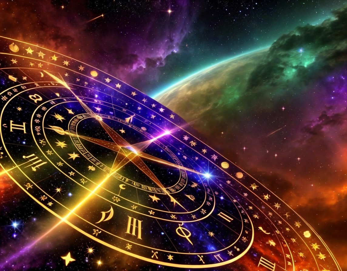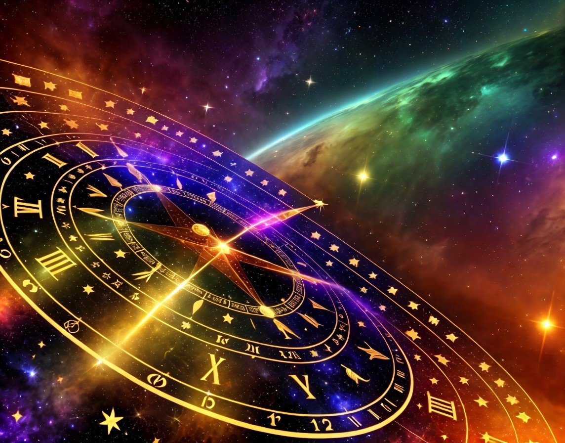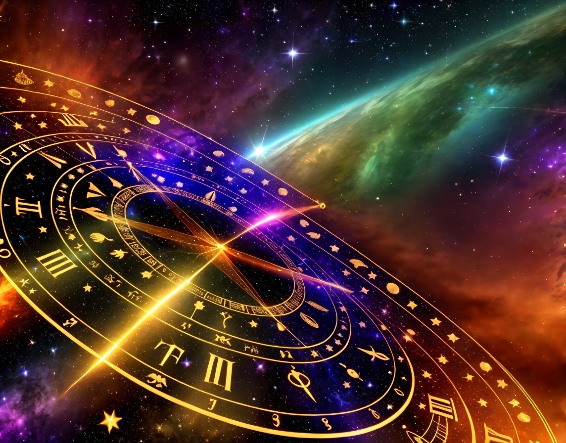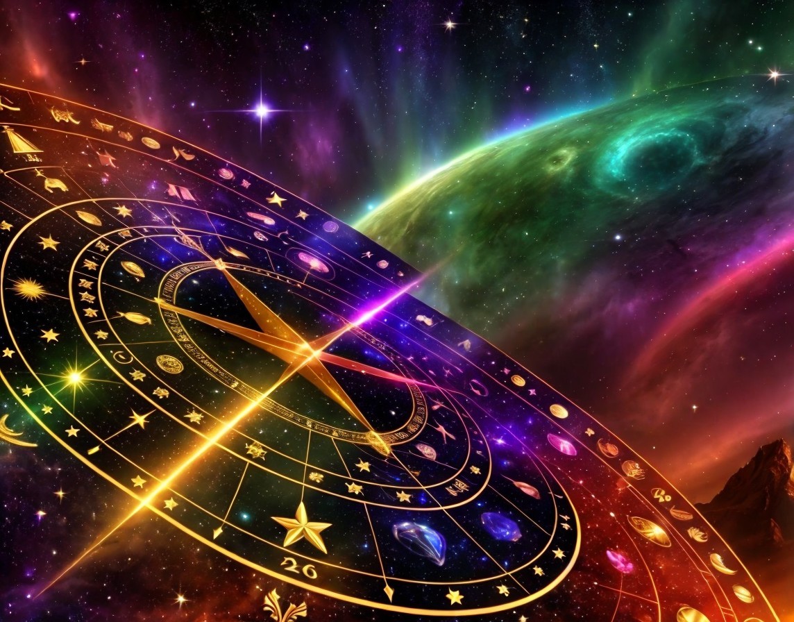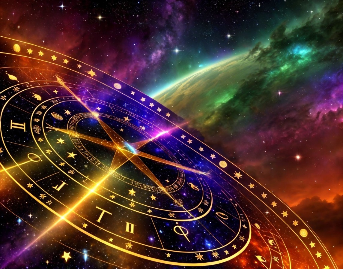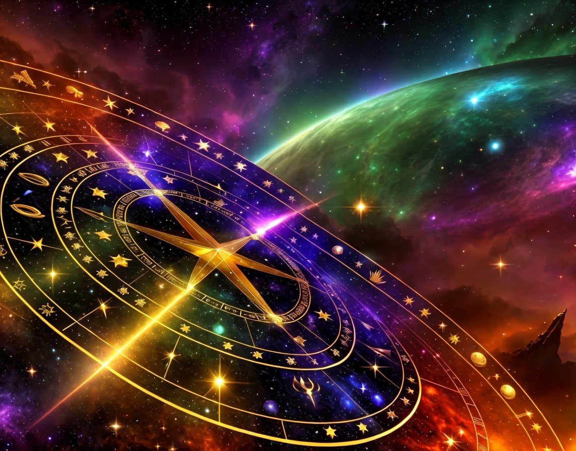 A vibrant cosmic background with a zodiac-themed astrolabe, celestial bodies, and swirling nebulas in rich, warm colors.