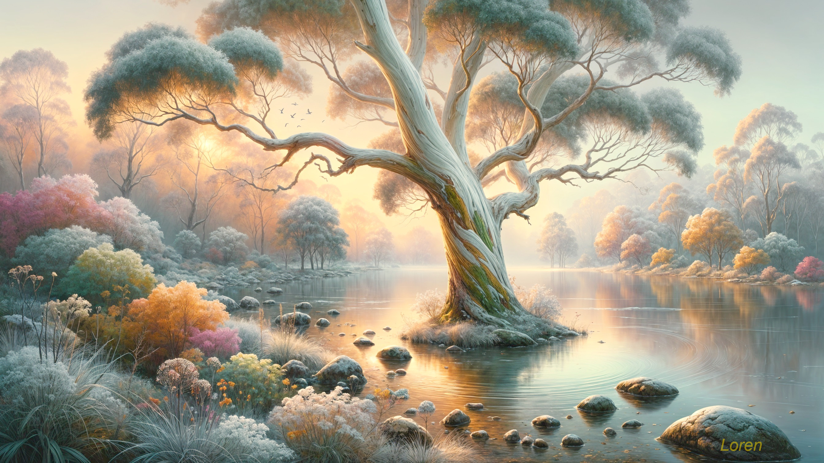 A serene landscape featuring a majestic tree by a tranquil lake, surrounded by colorful autumn foliage and softly glowing light reflecting on the water's surface. Peaceful and enchanting.