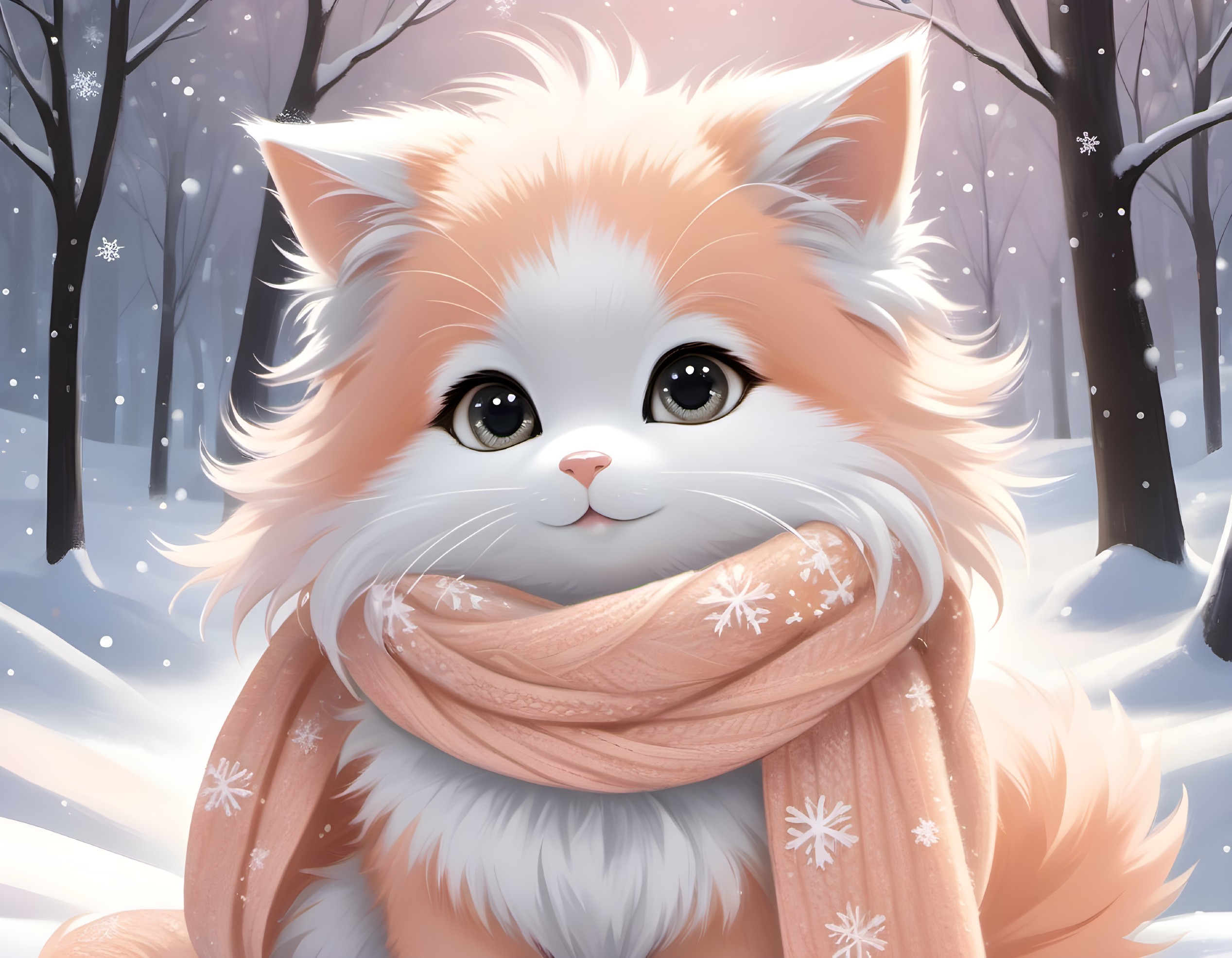 Imagine a charming winter scene with a fluffy creature donning a peach-to-gray gradient fur coat. Its innocent eyes gleam with curiosity, wrapped in a shimmering scarf amid a serene snowy landscape.
