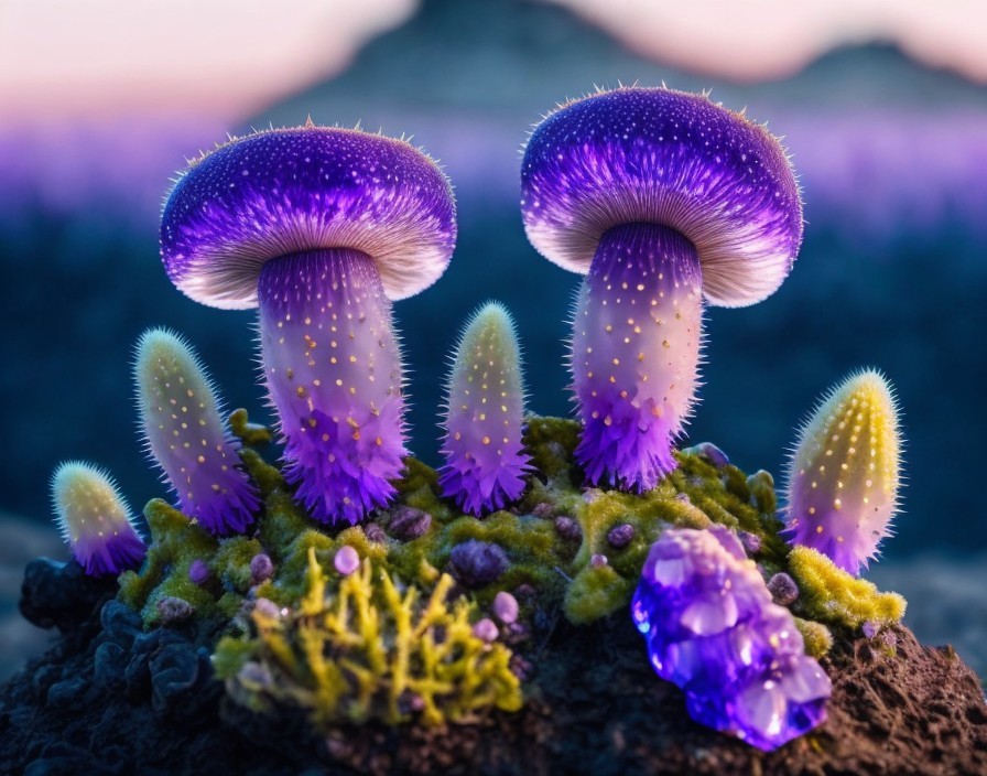 Vibrant purple mushrooms and small plants on a dark ground with a twilight sky in the background.