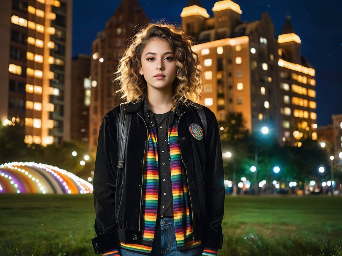 Prompt: "Mysterious urban scene, young individual with wavy hair, serious expression, black jacket, colorful patterned shirt, rainbow-striped socks, large spiny sea creature, segmented shell, urban background with buildings and grassy area, vintage sepia-toned quality, nighttime setting, tree covered in sparkling lights, magical ethereal effect, serene and peaceful ambiance, glowing plant against dark background, surreal and thought-provoking juxtaposition, evocative and atmospheric, captivating composition, enchanting and mysterious, digital illustration, detailed and high quality, warm golden lighting, Artstation."