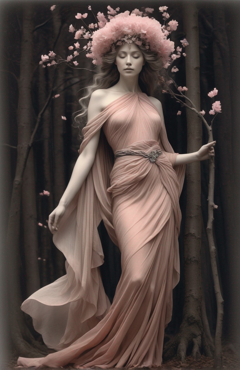 A woman in a flowing pink gown and floral headpiece stands amidst trees with pink butterflies around her, exuding a surreal, ethereal aura.