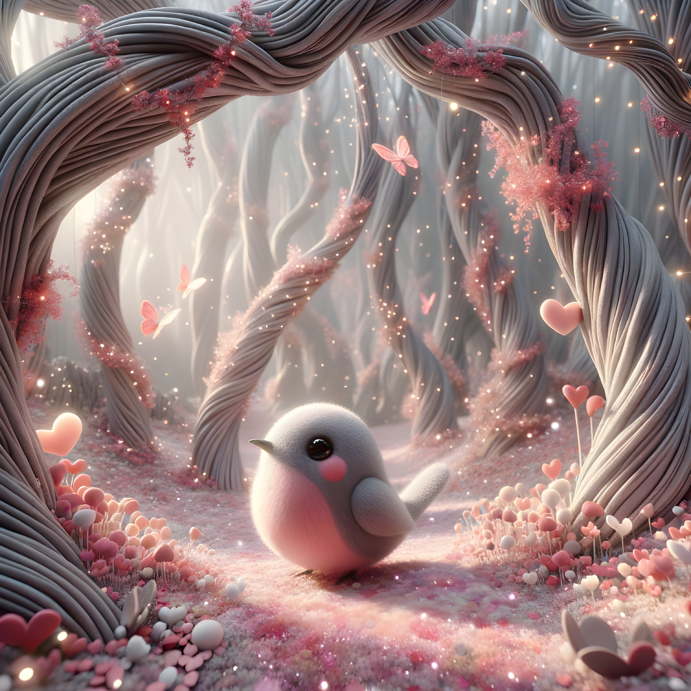 In a whimsical forest, twisting trees with smooth grey bark bloom with pink flowers and fairy lights. Heart-shaped petals carpet the ground, while a charming pink-bellied bird and fluttering butterflies create a magical, serene atmosphere.
