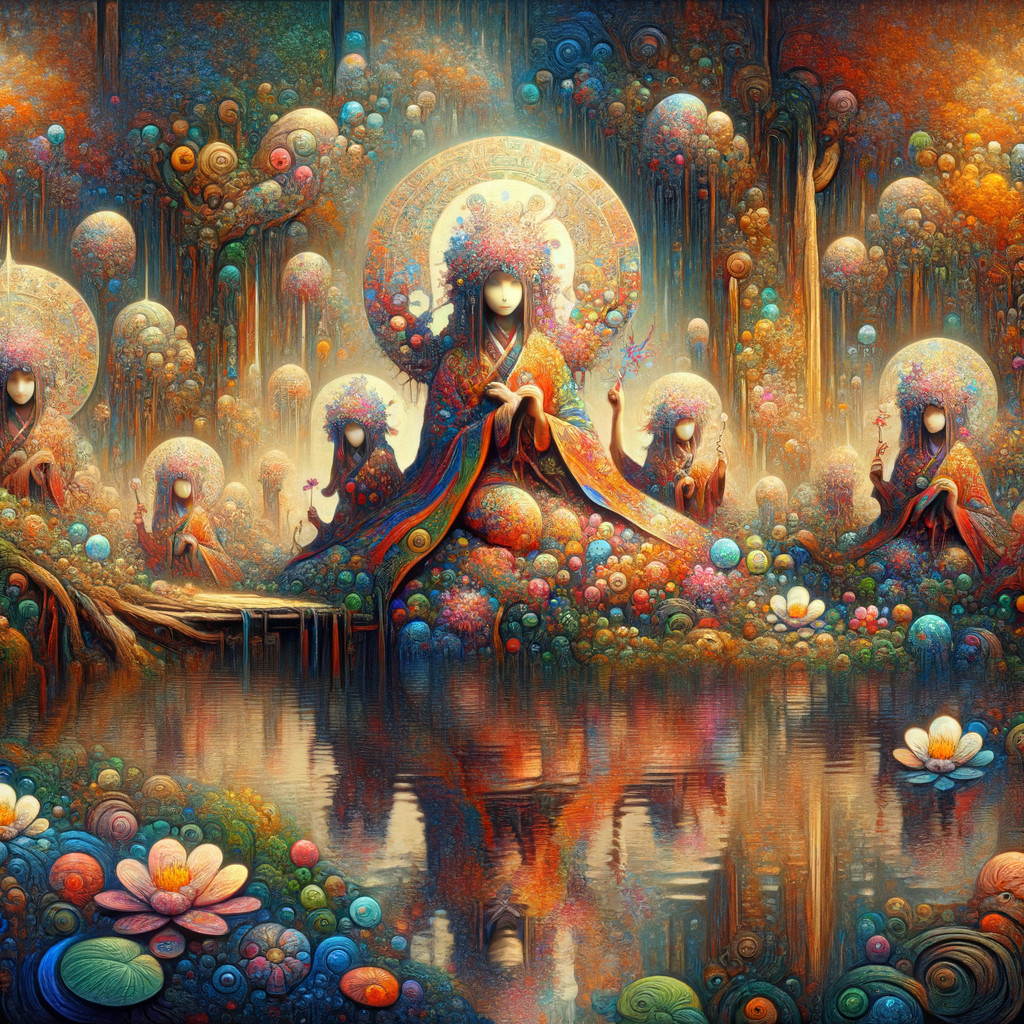 A whimsical creature sits among water lilies, reflecting in a serene pond. With a pinecone-like crown and vibrant scales, it blends seamlessly with the lush, enchanted surroundings.