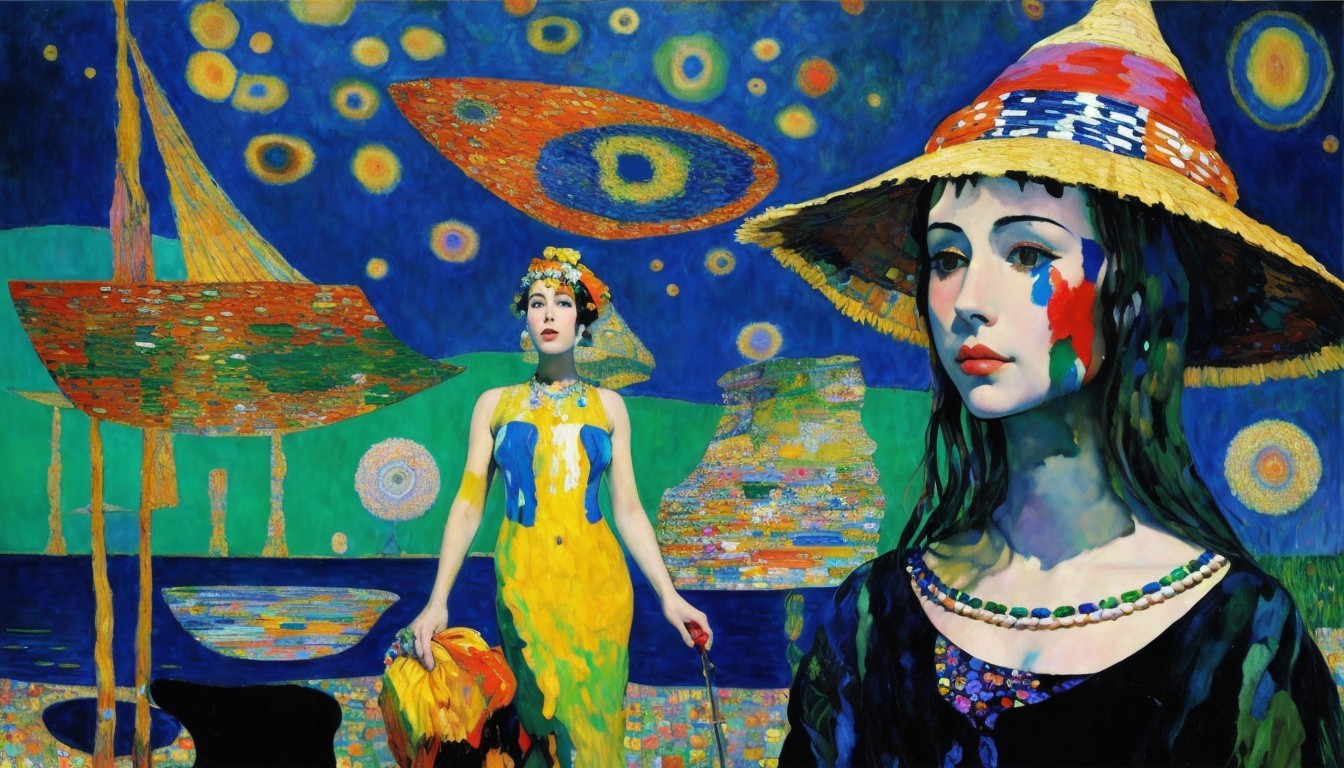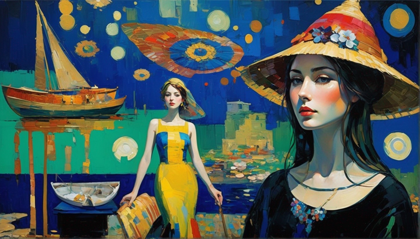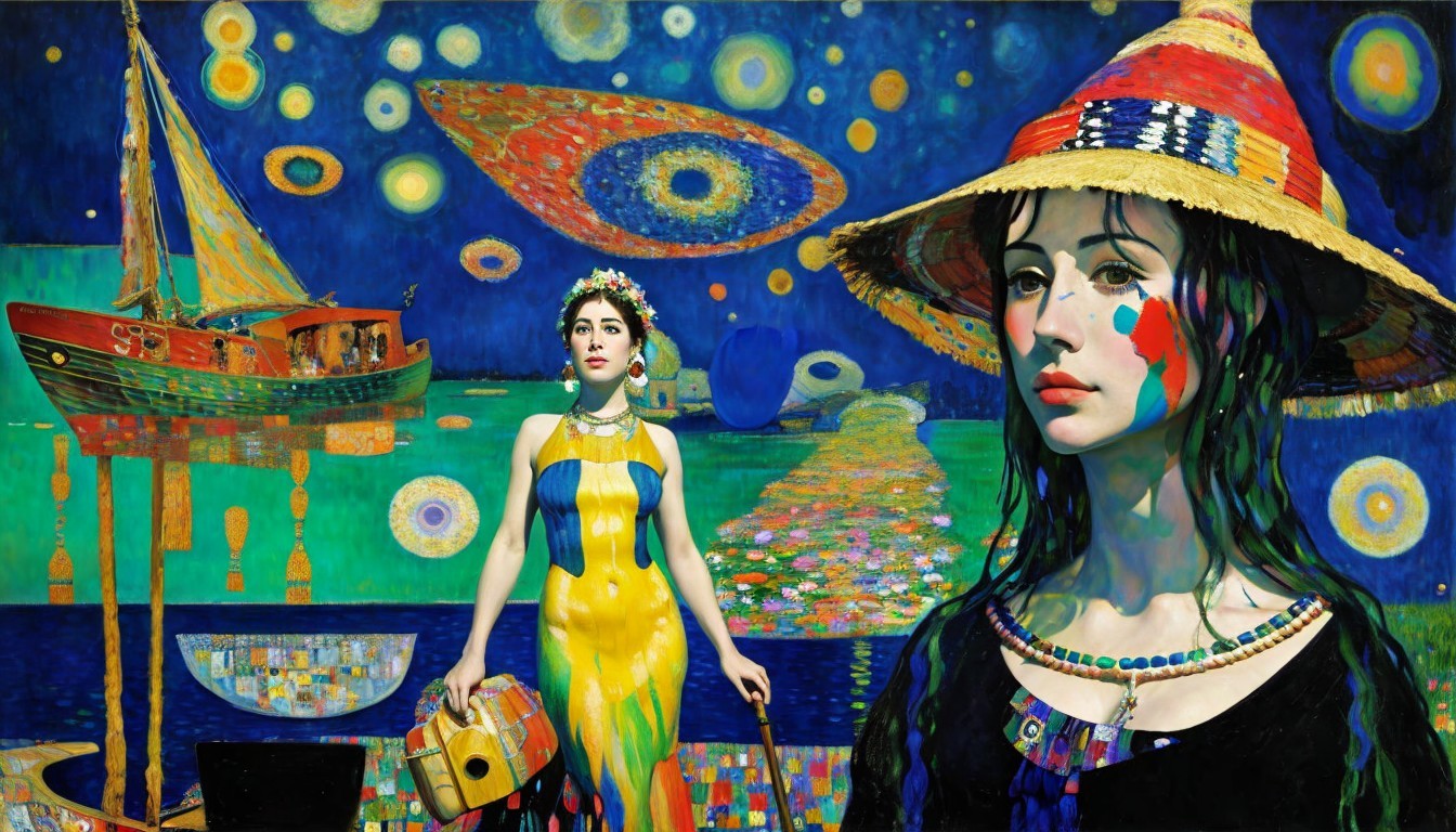 A vibrant painting featuring two women with elegant hats, a sailboat, and a colorful, abstract backdrop suggestive of a coastal scene.
