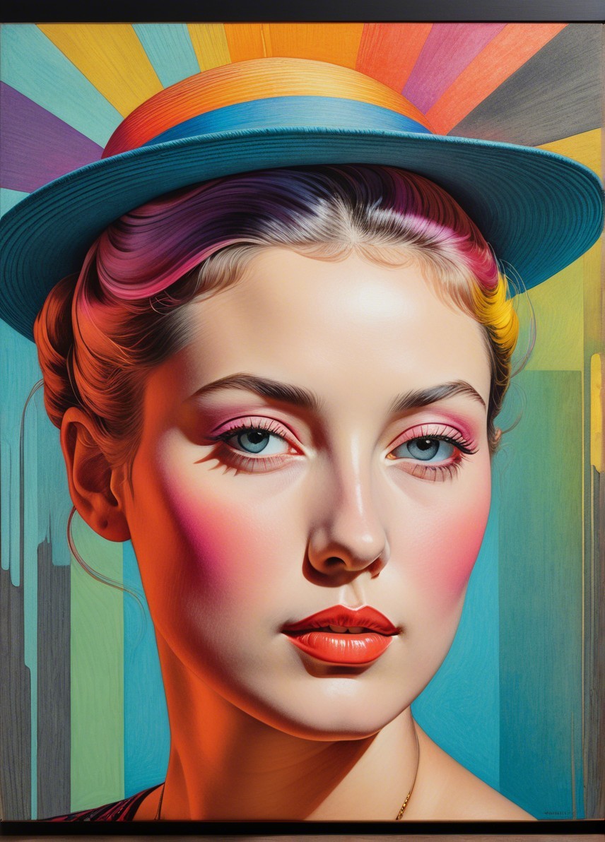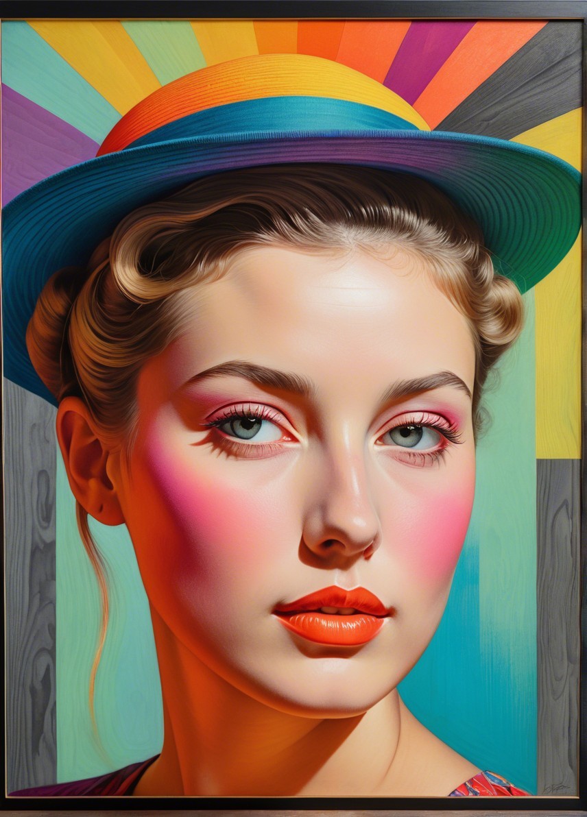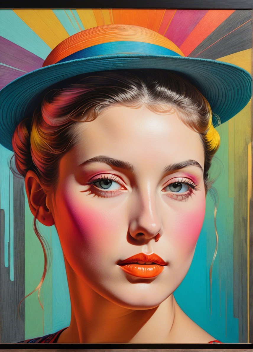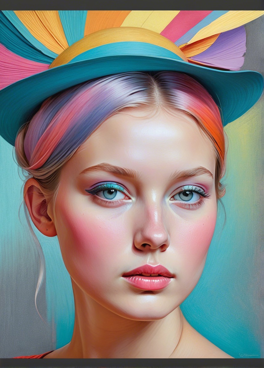 The image features a portrait of a young woman with striking features, wearing a stylish blue hat. Her soft makeup highlights her expressive eyes and bright red lips against a vibrant background.