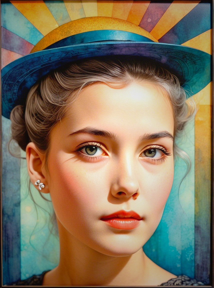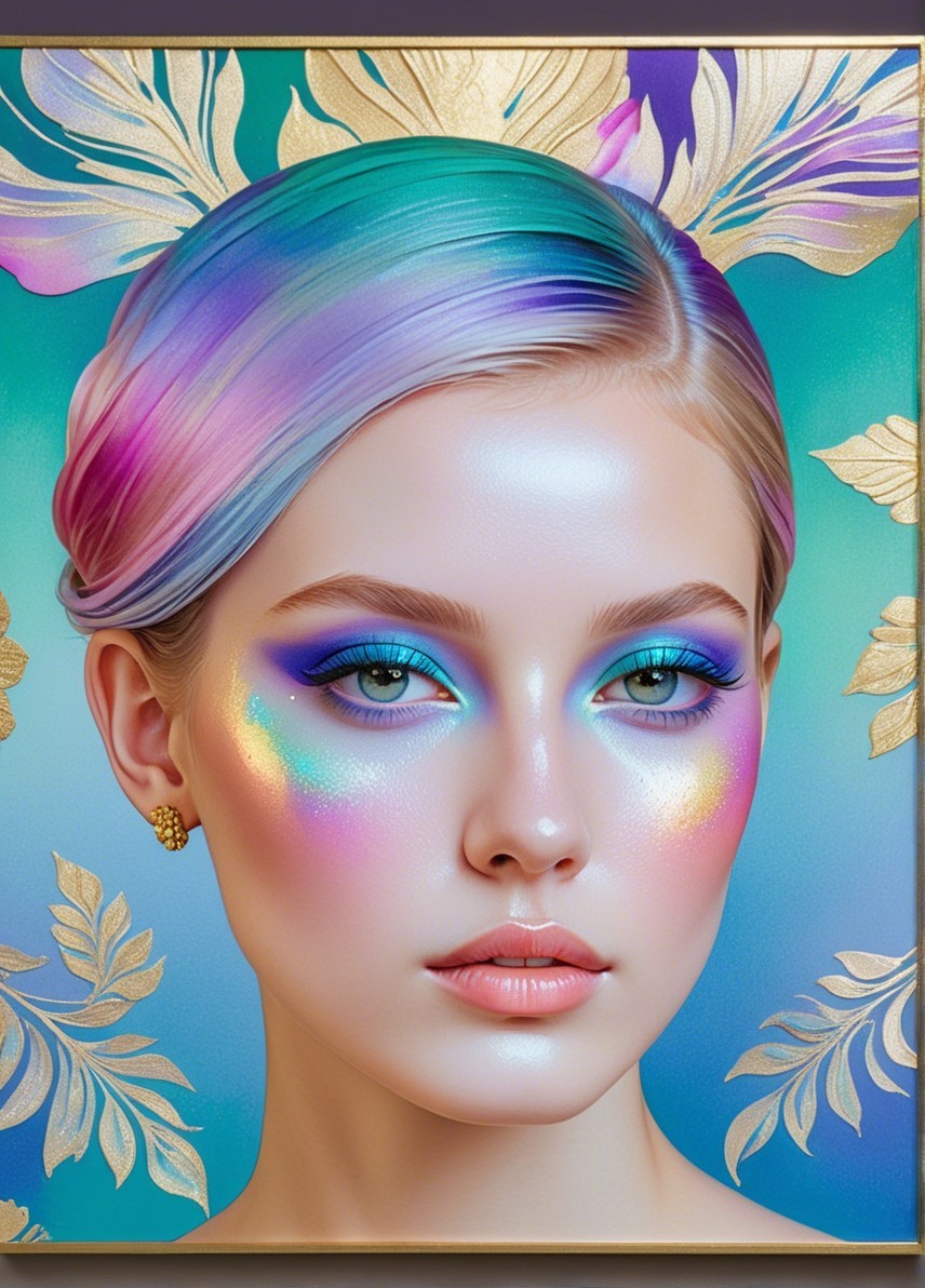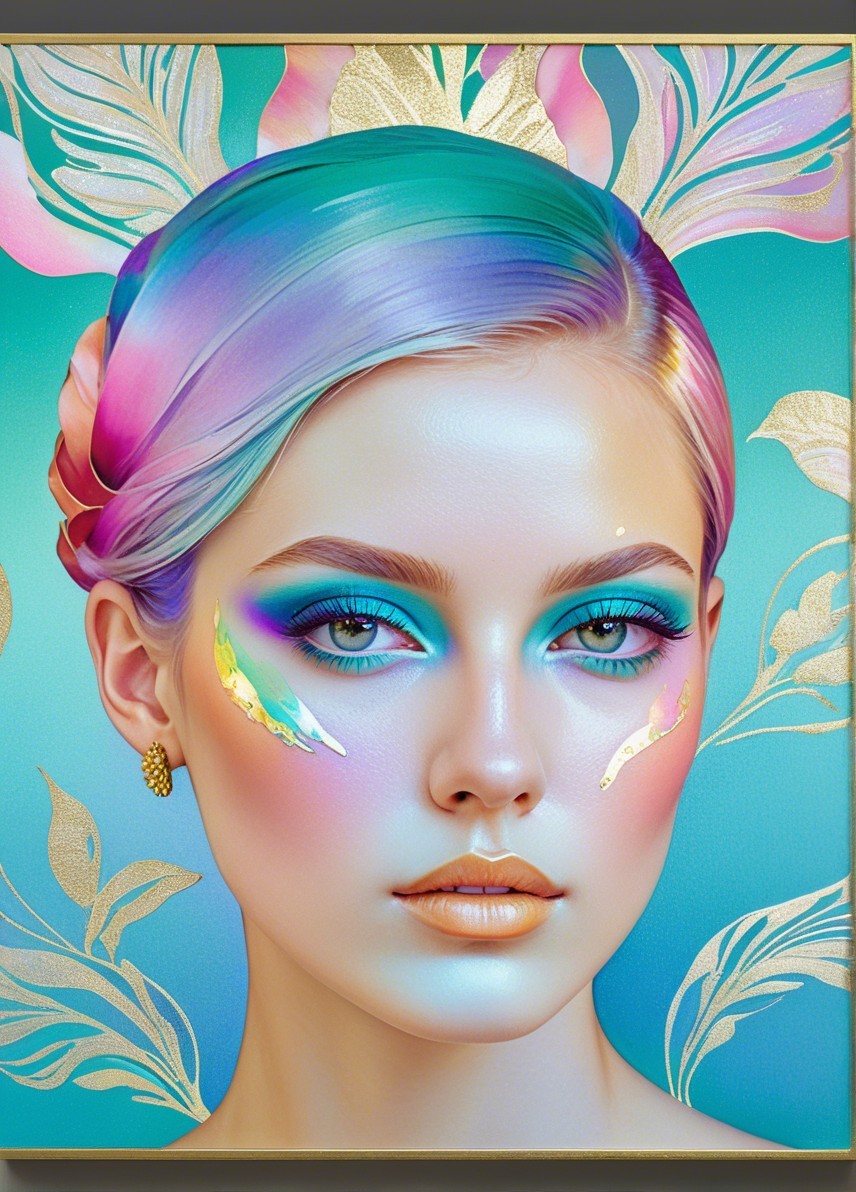+ Prompt:Masterpiece figurative portrait, styled by Paul Cadmus, featuring a color glitch effect with a melted appearance. The headshot is detailed with tiny strokes and iridescent watercolor overspray, creating a fantasy art piece by Florianne Becker.Intricate ornamental design, symmetrical floral centerpiece, layered petals with fine patterns, ornate embellishments, gold and purple color palette, creamy white background, smooth and textured finishes, delicate filigree work, mysterious woman's face integrated into the geometrical structure, intense gaze, serene and sophisticated ambiance, detailed and rich illustration, intricate details, Fractals and zentangles, sharp focus, beautiful, hyperrealistic, ultra-detailed, high definition, crisp quality, colorful, HDR, Pixar, volumetric lighting, high octane render, anthropomorphic, neon art, 3D texture, brush lines, 64K UHD HDR, 3D. The color palette includes pastel tones of beige, blue, and lilac, with bioluminescent eyes and liquid-pearlescent-plasma elements. The artwork showcases prismatic tilting, 3D effects, and a multi-layered, multi-perspective composition. Chromatic induction techniques are used, with hues by Alex Schomburg, enhancing the surreal natural elements and stacked-up perspective. One third rule, shades of blue, purple, and hints of pink, dreamy atmosphere. Incorporate stylized shapes resembling soft, glowing trees using whites and warm pastels to enhance the dethereal feel of the scene.The background should include subtle gradients from deep blues to lighter hues, whimsical shapes and an impressionistic style, reminiscent of woodcut-inspired graphics, unique, luminism, Finely rendered, layered, Complex and Elaborate, Complexly detailed, Imaginative Absurdist, pen and ink, darkened earth tones, charcoal Drawing by Michael Parkes, dew drops, Marinism, physically based, 64k rendering, estranged metal paints. Overall composition by Georgia o'keffee and Arlie Opal