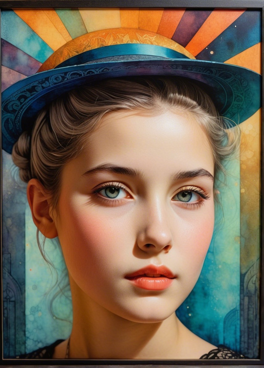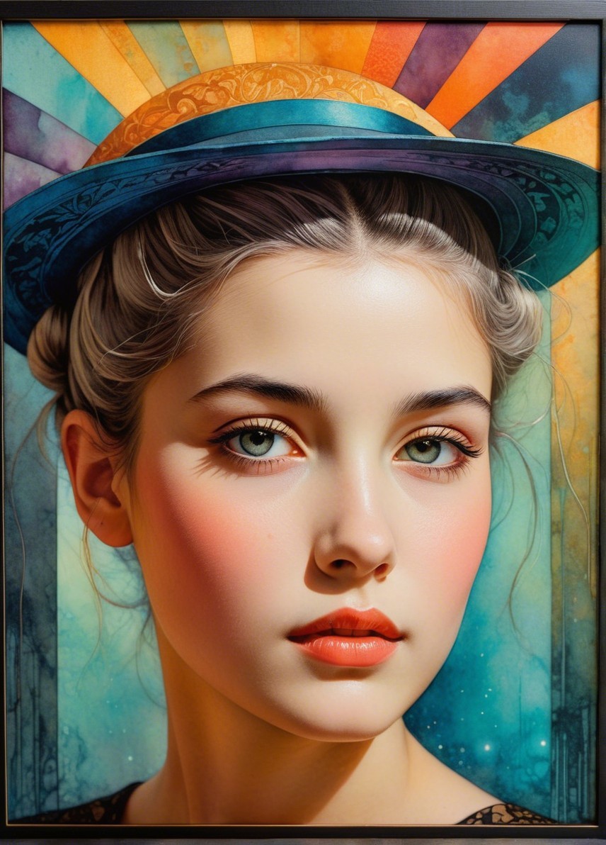 Prompt: Gothic-inspired woodblock print featuring a stylized and otherworldly portrait with a juvenile essence. The art style is reminiscent of Susan Seddon Boulet stylized by stan lee, 1920s book cover art, propaganda poster, vintage reminiscence, multi-layered, hues, remiscent of watercolor and ink by arlie opal, 3d effects, parallax occlusion, bokeh, debeh, aquarel extrusion, luminous patterns, glittering, appealing, mesmeric, warm color palette featuring shades of pale blue and warm beige, pointillism details, evoking pop-art. Colored charcoal fantasy, 1980ties european adult comic style, line-art, fantasy art., joyful, dark fantasy, line-art details, overspray of paint, The lighting is soft and diffused, enhancing the magical and mystical ambiance. The overall composition is by Georgia O'Keeffe and Arlie Opal, combining elements of casual line and wash sketch with a foampunk twist.The artwork is rendered in UHD HDR using Octane render, emphasizing a cinematic and comic book art style in the style of Paul Klee, William Turner, Arlie Opal, ho Baron, Alphonse Mucha, stylized Patchwork, overall composition by Rufus Dayglo, hues, dyed, action painting reminiscence, simplistic, contoured, hallucinogenic, dappled rim lighting. Surrealist psychopomp theme,hyper-realistic, motion blur, ethereal, dreamlike, long-exposure, nature photography, fragmented. The splahy textures add depth, while the stippled effect creates a coherent and intricate look, blending elements of fantasy heroines in the style of Overton Loyd and Steve Hanks. Various rendering techniques such as parallax occlusion, ambient occlusion, and raytraced shadows enrich the visual experience, warm pastel coloring. Precise gelsculpt 64k, flowing hair illusion, clear dramatic shadows, high contrast lighting, digital painting, maximalist style,exuding a delicate yet mysterious aura. Her face is detailed with multi-layered eyes, vintage and Edwardian styles by didier laurenco and arllie opal