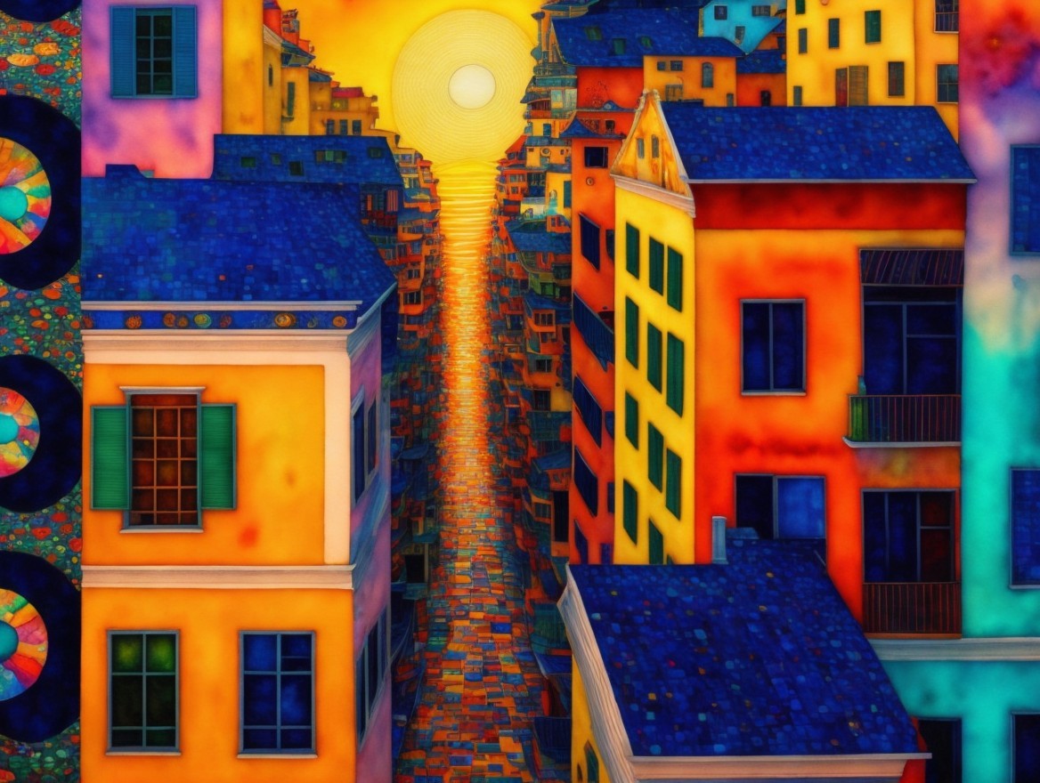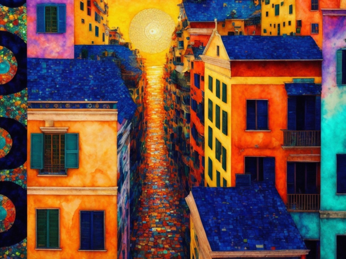 A vibrant cityscape at sunset, featuring brightly colored buildings with blue rooftops. A glowing sun casts warm light on a winding pathway, creating a lively and enchanting atmosphere.