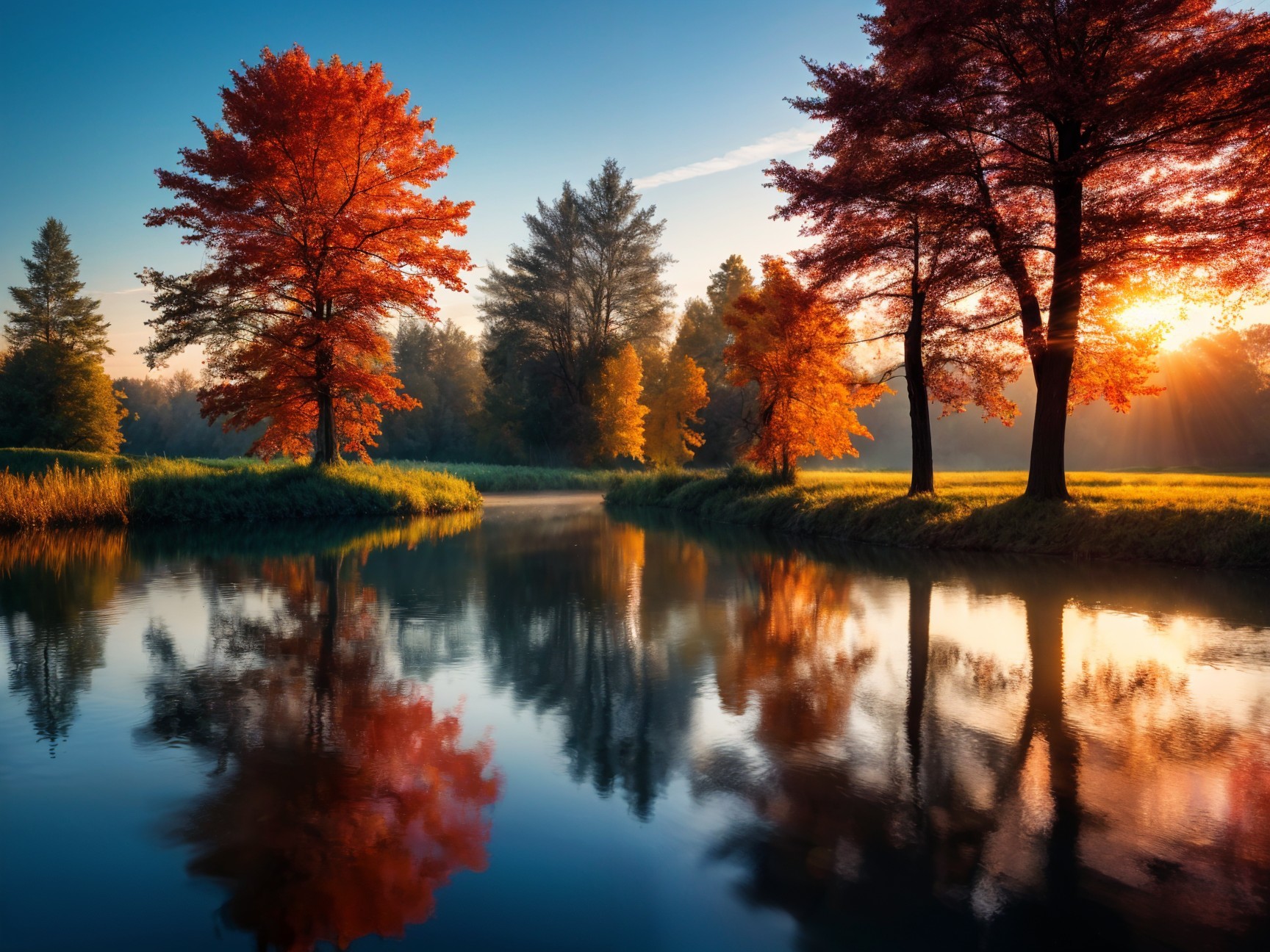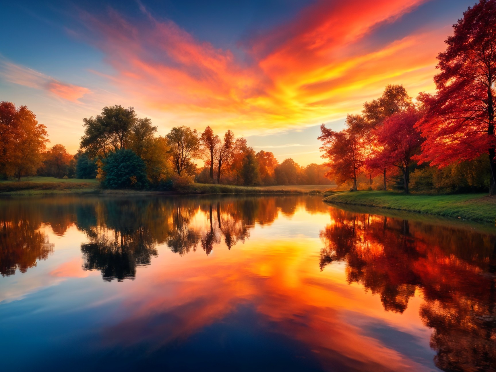 A vibrant sunset paints the sky with warm hues over a tranquil lake, reflecting fiery autumn trees along the shore, creating a serene and picturesque nature scene.