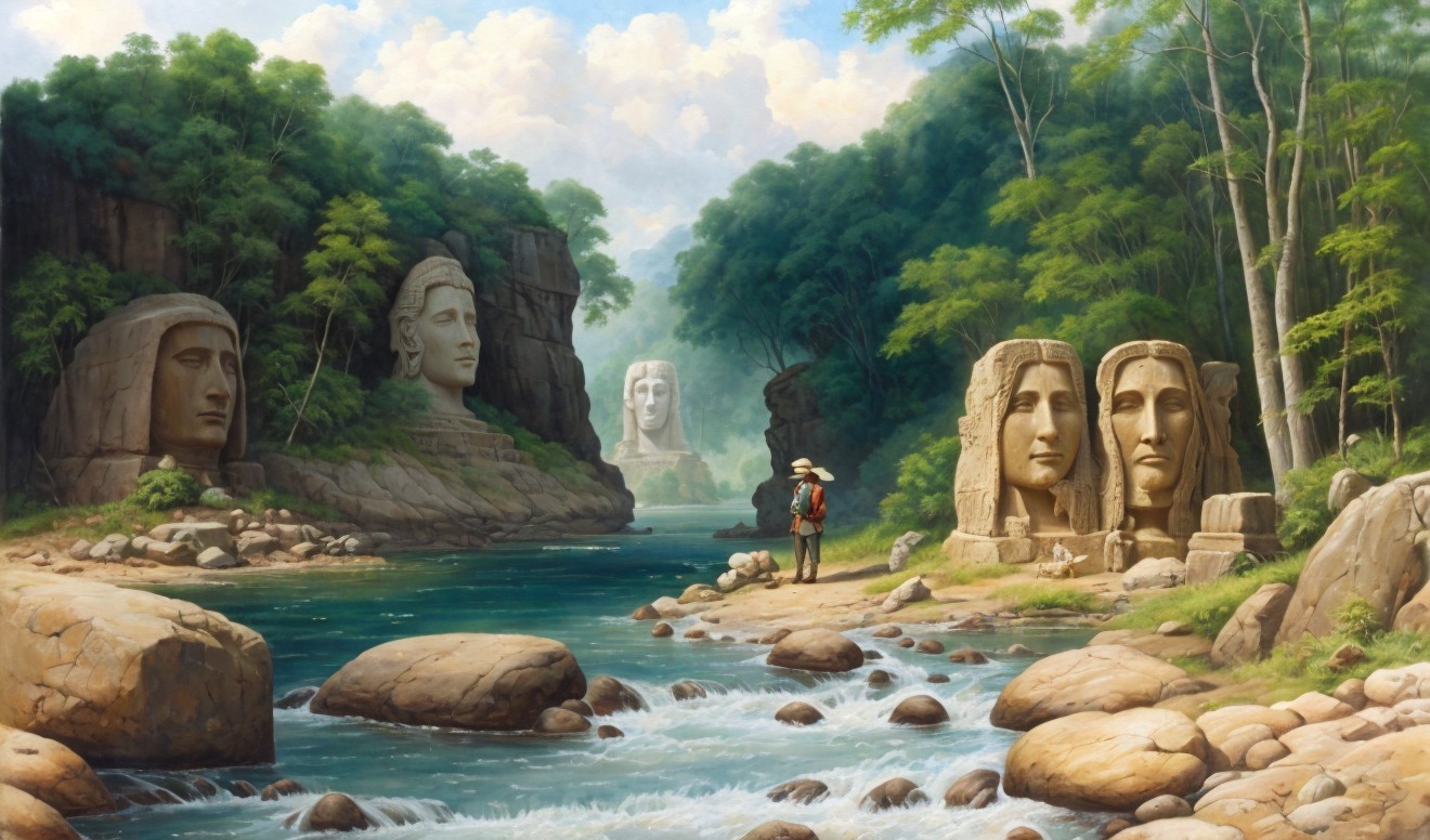 In the depths of unexplored jungle, an explorer discovers a river with colossal stone faces un either bank as if marking the entrance to the distant waterfall.