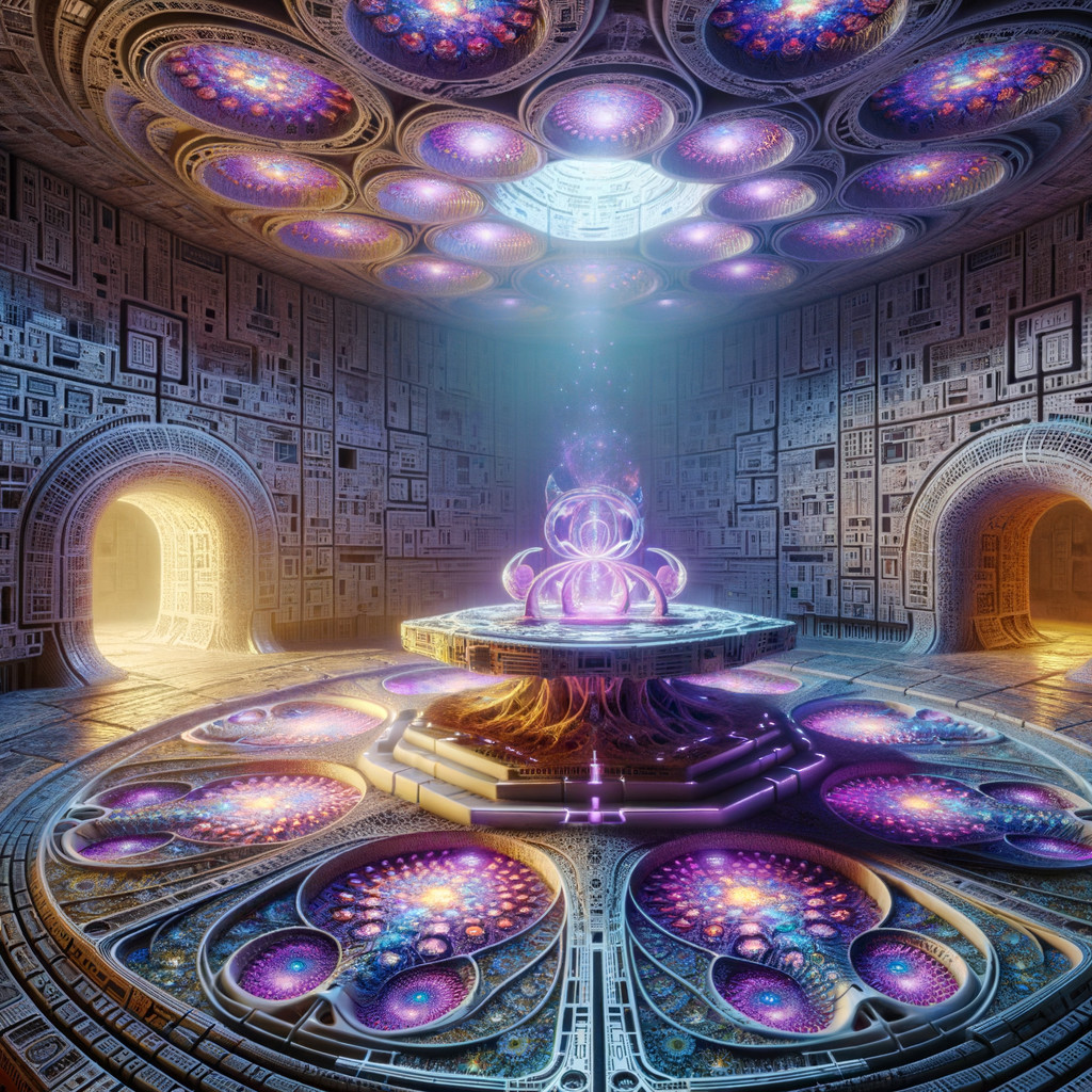 A mystical chamber features a luminous beam of light illuminating a circular table with ornate designs. Graceful cats stand around the table, surrounded by glowing purple patterns on the stone floor.