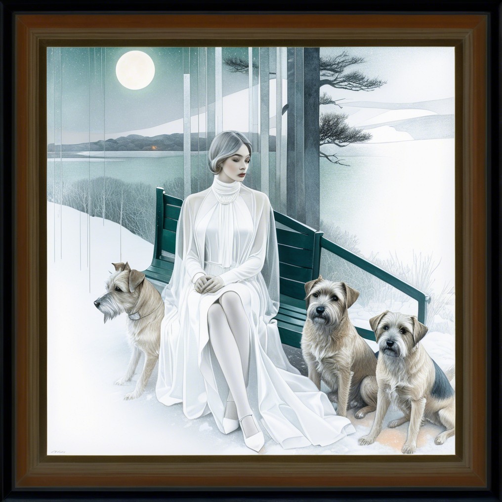 A framed digitally painted image depicts a beautiful young woman sitting with three terrier-type dogs on a park bench covered in snow under a full moon. The woman, with a fair complexion and light gray hair styled in a chic bun, is dressed in an elegant high-necked white gown with a flowing transparent