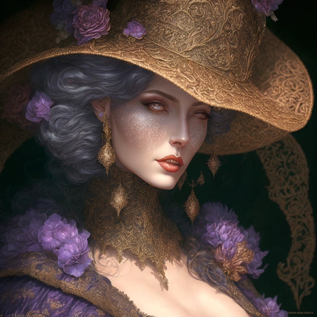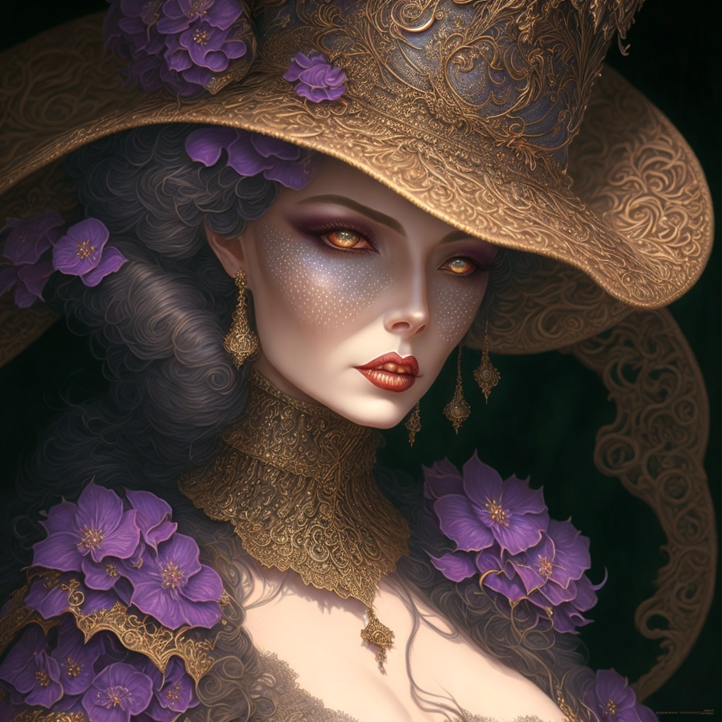 A stunning woman adorned in intricate gold and purple attire, featuring a large decorative hat. Her captivating eyes and ornate jewelry complement the elegance of her floral embellishments.