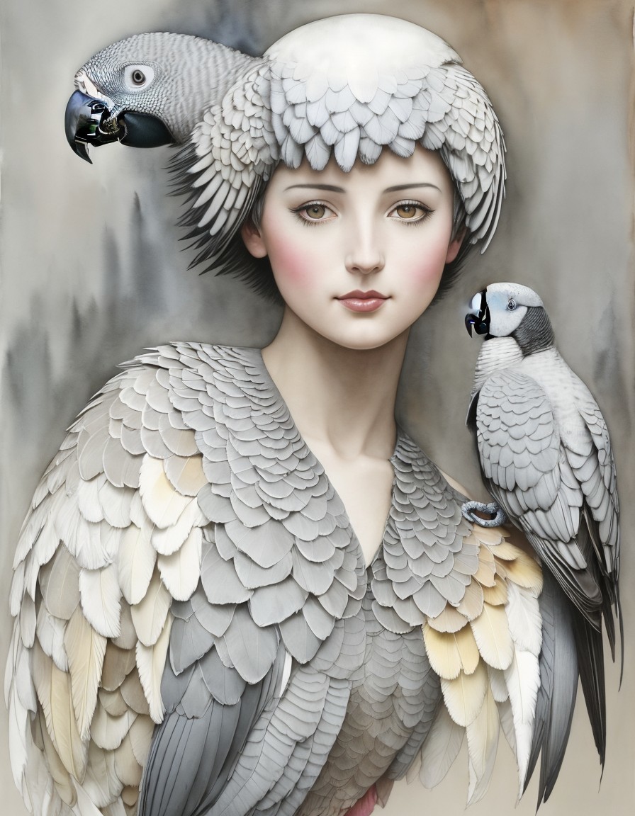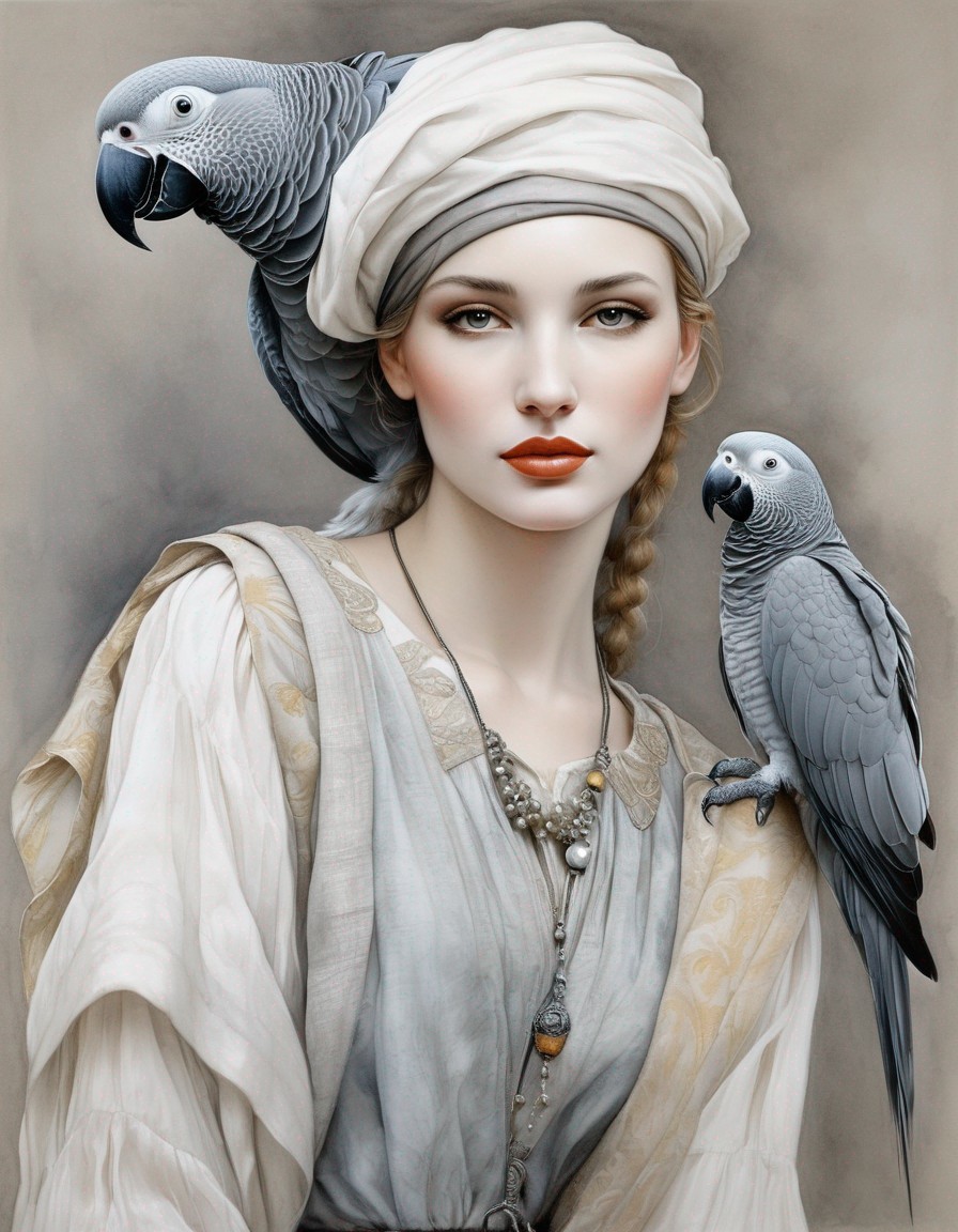 A woman in a white turban is accompanied by two grey parrots, exuding an elegant and exotic aura.