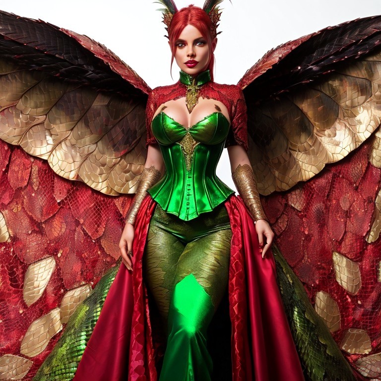 Prompt: "Full body shot of a beautiful hybrid snake woman, Beautiful reddish eyes and face covered by scales with reptilian features, large fangs appearing between his lips, reddish green colors in her body covered by precious feathers, moss and scales, sensually dressed in a red and gold mossy corset with a lot of details. Mystic, magic. Evil fairy tale in a snake form, vibrant colors, chibi monster, perfect composition, chiaroscuro, masterpiece,raphael, Greg Rutkowski, Beeple, Giger and Jean Baptiste monge styles"