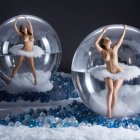 Two models in blue bikinis pose inside large, transparent bubbles filled with snow-like elements, surrounded by shimmering blue beads, set against a dramatic backdrop.