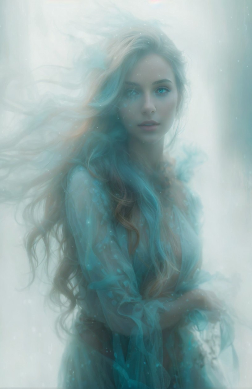 A woman with flowing blue hair and a mysterious gaze surrounded by a frosty, ethereal atmosphere.