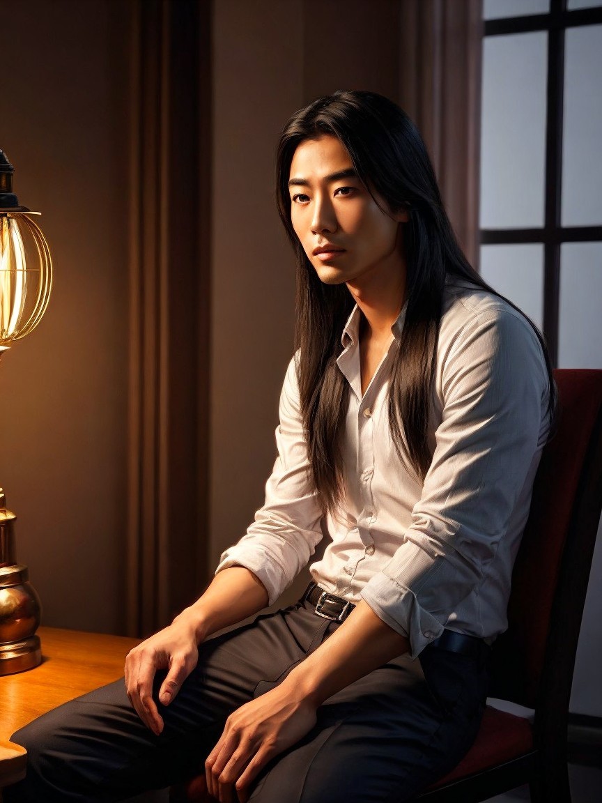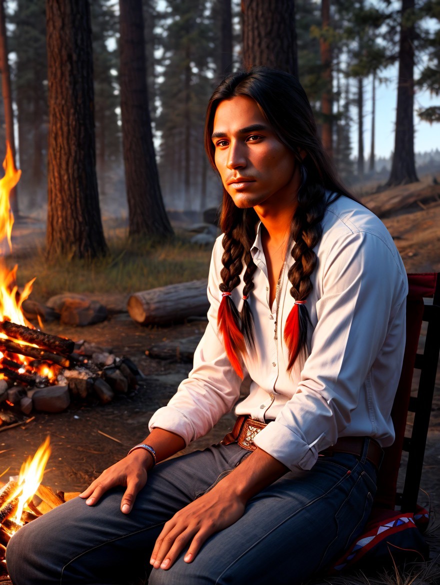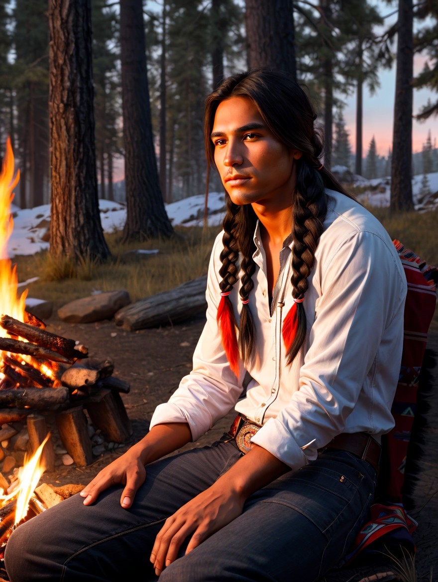 A native american man sits by a campfire in a forest. He wears a light shirt, reflecting on nature, surrounded by tall trees and a peaceful atmosphere.
