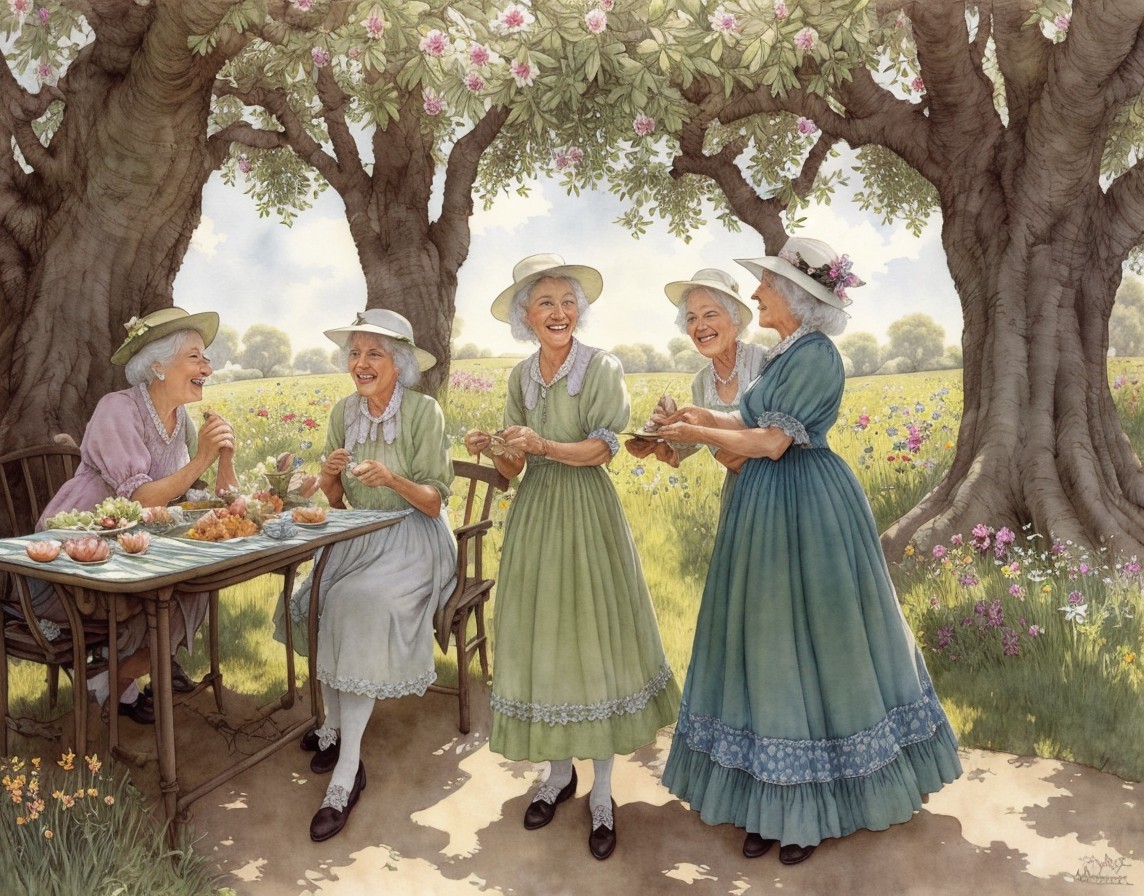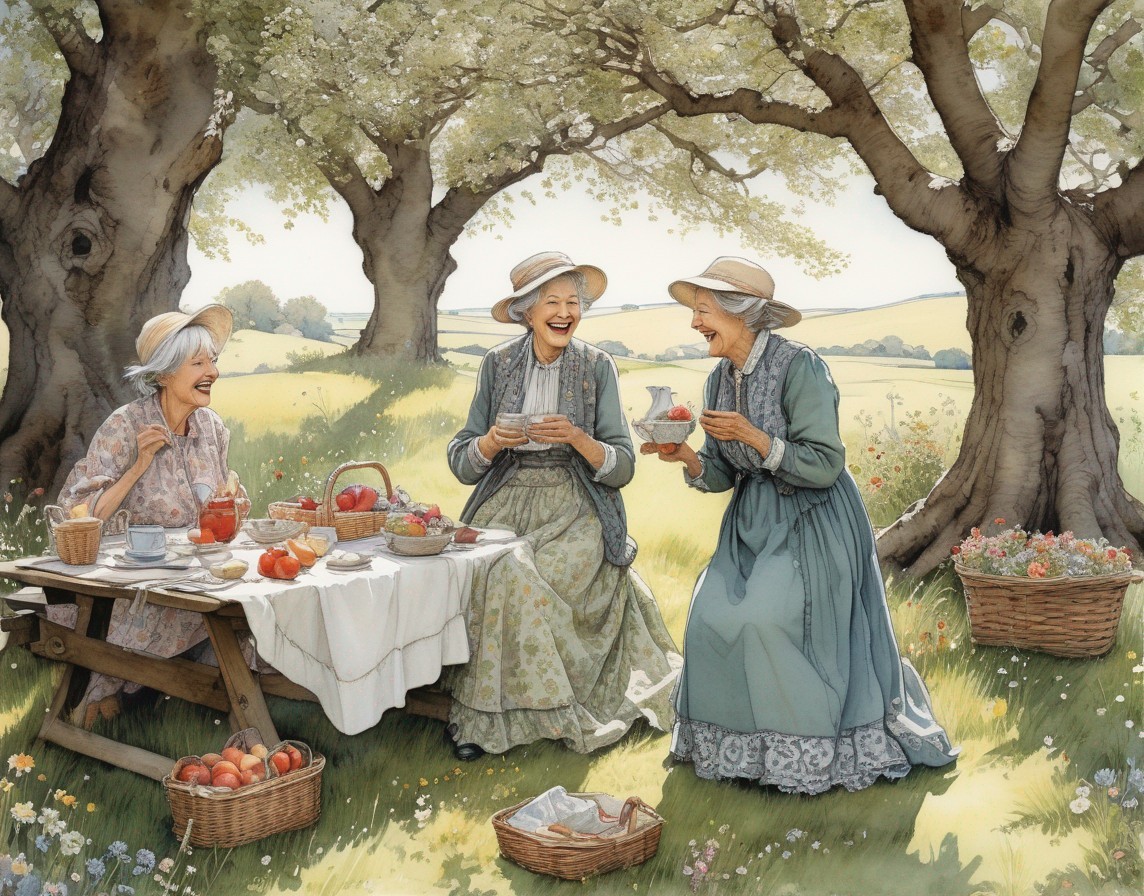 Three elderly women share laughter over tea and snacks outdoors under trees on a sunny day.