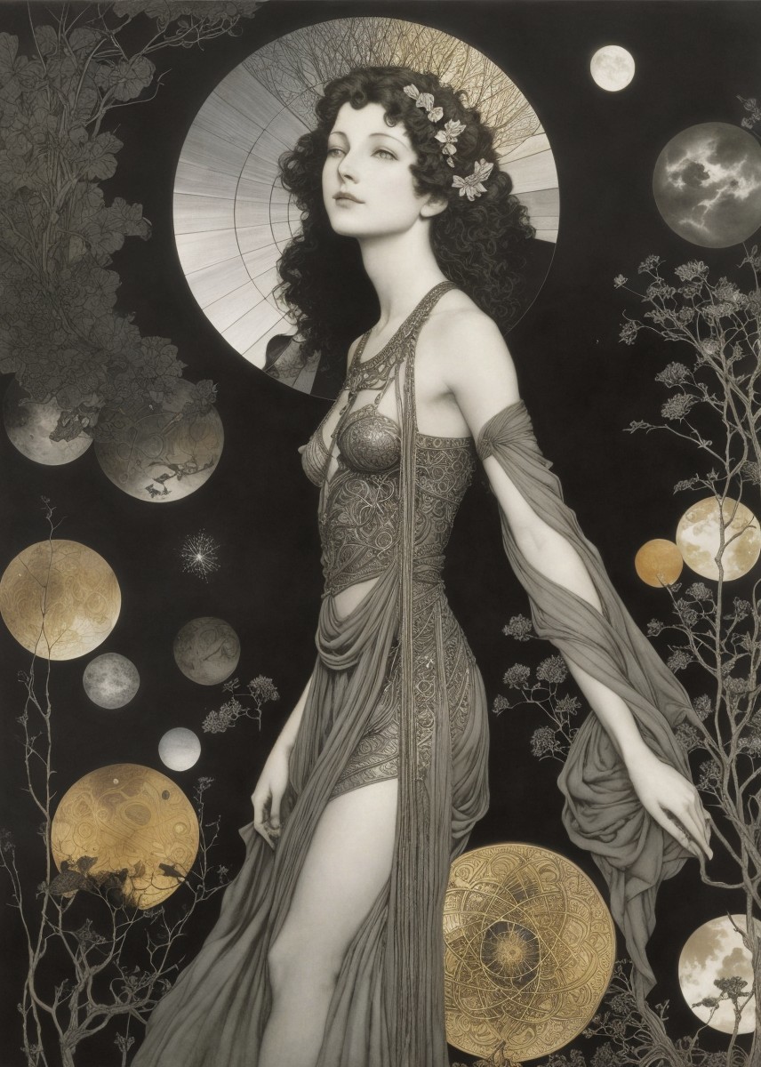 A mesmerizing figure stands amidst a cosmic backdrop, adorned in silver attire and intricate accessories. Ethereal strands of hair frame her face, while celestial bodies orbit around her.