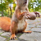 A cute squirrel with orange and gray fur sits on a forest floor, holding an acorn. Sunlight filters through the trees, highlighting its fluffy tail and bright eyes in a serene woodland setting.