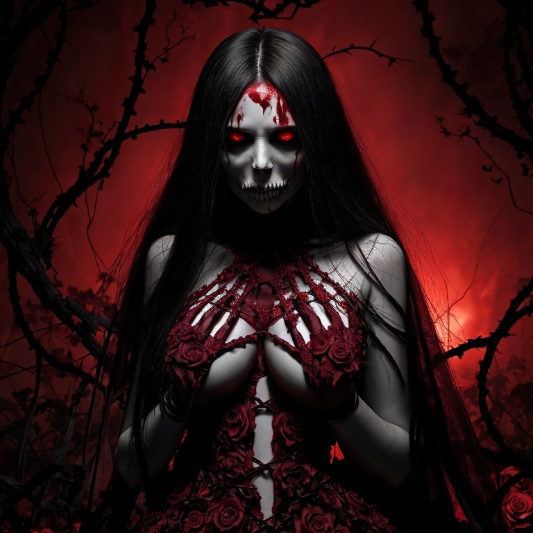 Prompt: A demonic figure with hollow eyes and sharp, skeletal hands reaching out toward a figure ensnared in thorny vines. The vines are blooming with dark, blood-red roses that drip with a sinister, glowing liquid. The figure’s face is twisted in agony as the vines tighten around them, drawing blood. The background is a burning wasteland, with a crimson sky split by lightning, suggesting divine retribution. The overall tone is one of dark temptation leading to eternal torment.